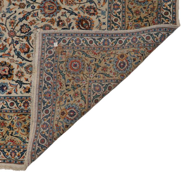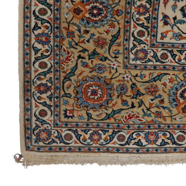 Wool on cotton foundation, the cream field with small central floral medallion with allover multicolored floral and foliate lattice design, the taupe main border with repeating scrolling palmette and foliate motifs, within multiple minor floral and foliate borders, with knotted fringe to one end, label to verso indicates made in Iran.