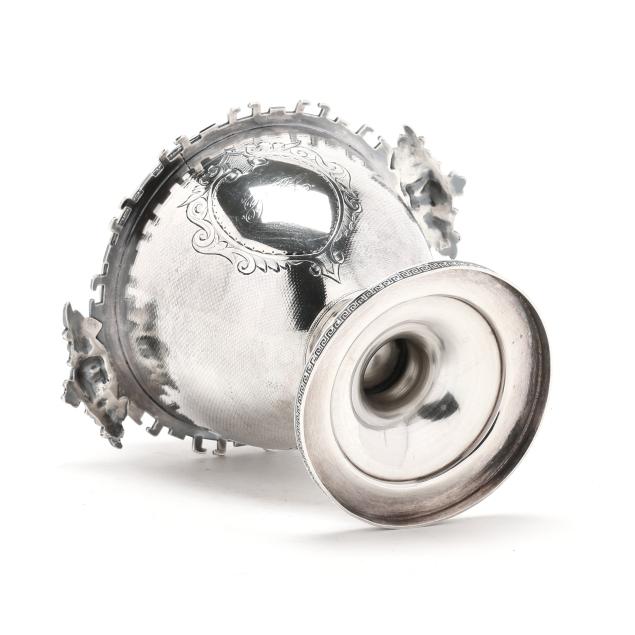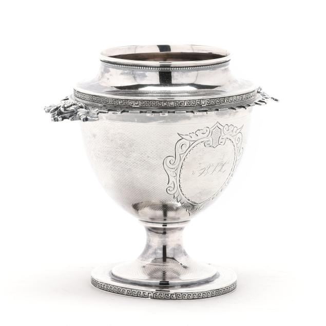 Circa 1870s, not marked, with key patterning to the foot and shoulder; engraved cartouche to each side, stylized protruding rim, without a lid, monogrammed, XRF tests .900 silver content.