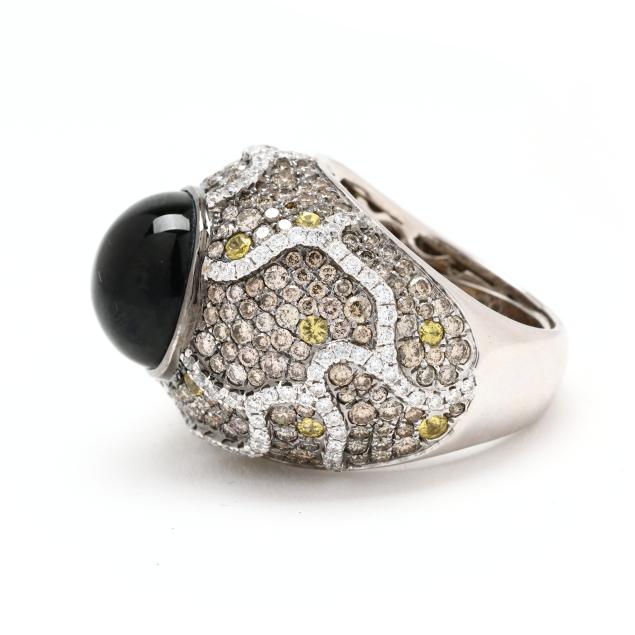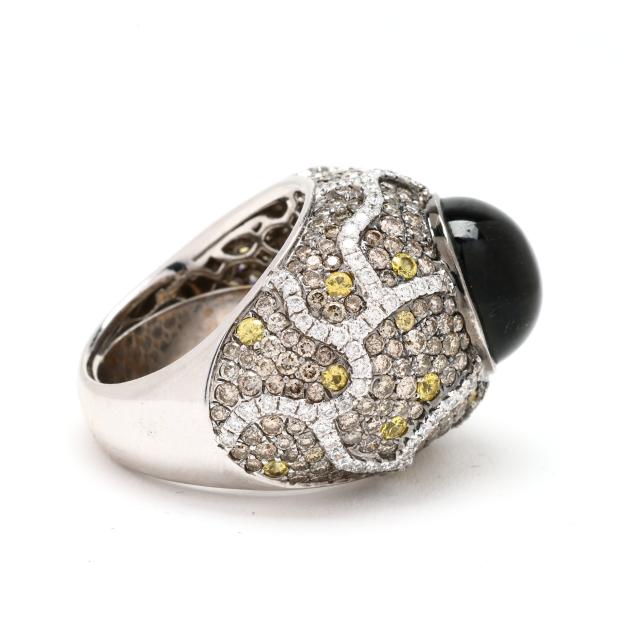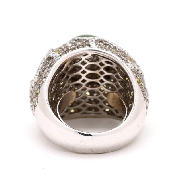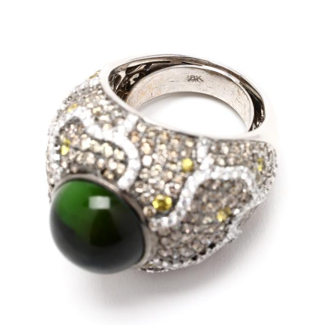 The dome ring centered on a round cabochon cut green tourmaline (12.5mm) and pavé set throughout with full cut round diamonds weighing approximately 4.50 total carats (I-Light Brown color, SI2-I1 clarity) and with round cut yellow sapphires, with a sizing bar, stamped 18K, ring testing 18KT.