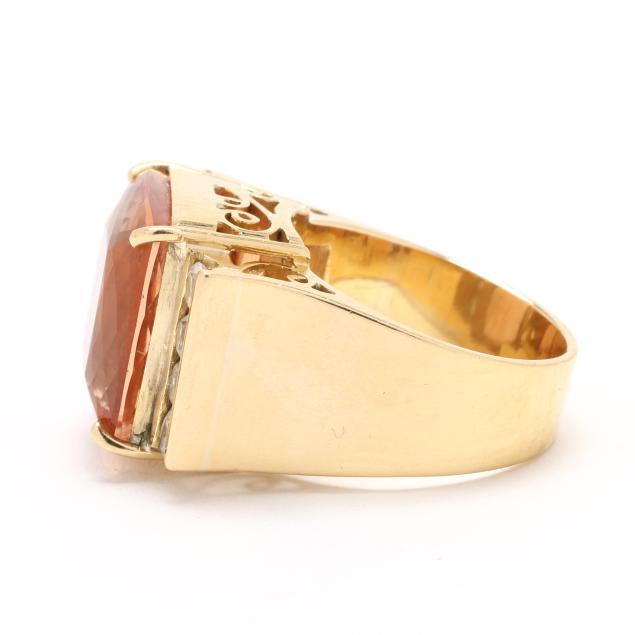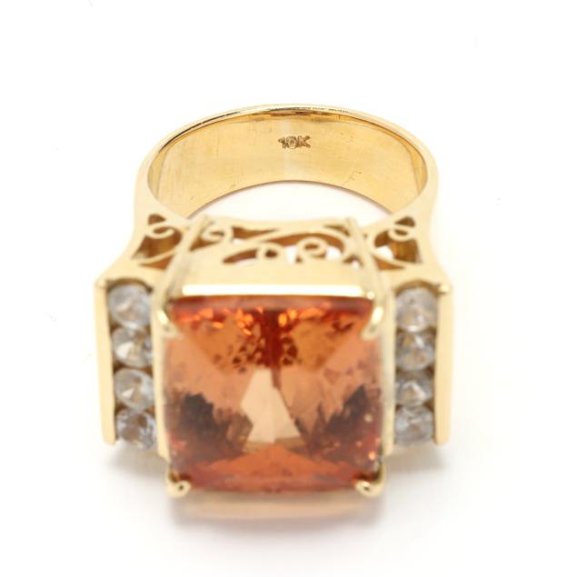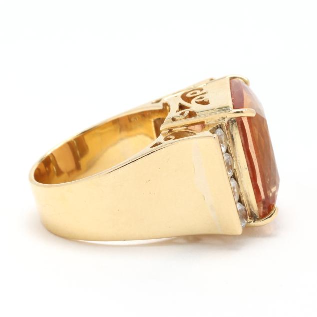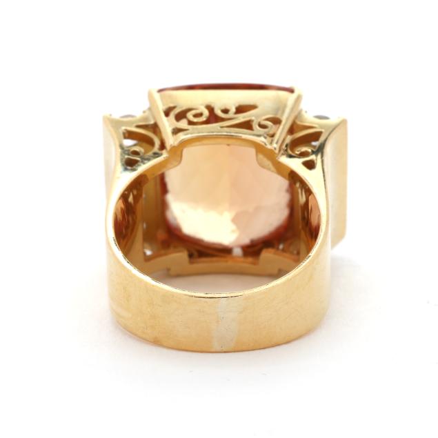 Centered on a rectangular cushion cut orange topaz (14 x 13 x 9.6mm) weighing approximately 14.0 carats, the shoulders set with full cut round colorless stones, shaped shoulders and scroll decorated gallery, stamped 18K.