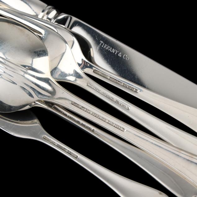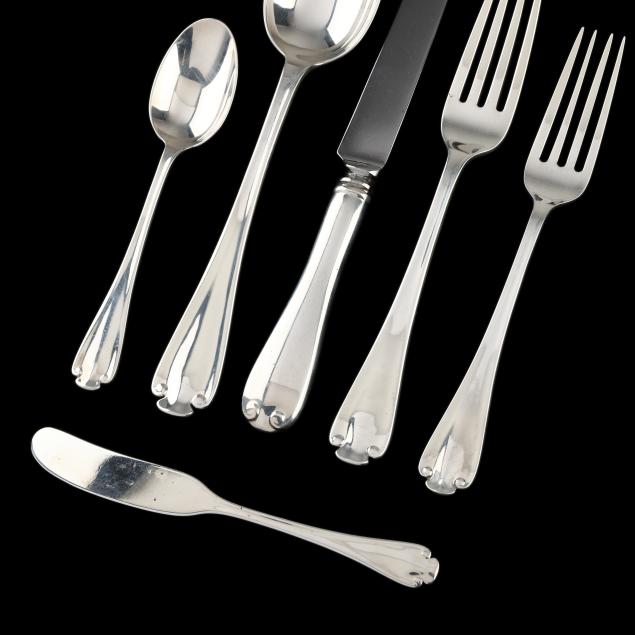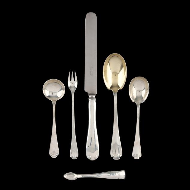 Patented 1911, (45) pieces to include: (6) dinner knives (10 1/4 in.); (5) luncheon knives (9 1/4 in.); (6) dinner forks (7 3/4 in.); (3) luncheon forks (7 in.); (4) teaspoons (5 7/8 in.); (6) bouillon spoons; (4) oyster forks; (4) tablespoons; (2) butter spreaders; (3) sugar tongs; a large jelly spoon; and a sugar spoon; not monogrammed