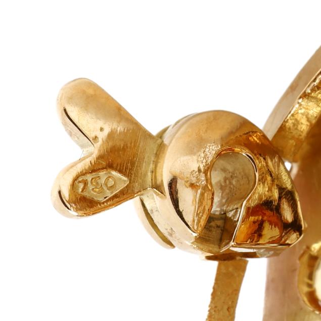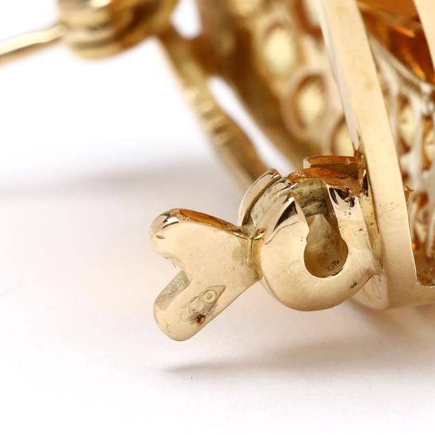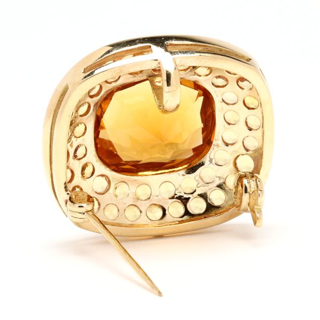 Centered on a bezel set cushion cut citrine (16.7 x 14.5 x 9.63mm) weighing approximately 14.0 carats in a surround of round cut citrines weighing approximately 4.5 total carats, completed with a fixed bail and a single locking pin stem, stamped 750.