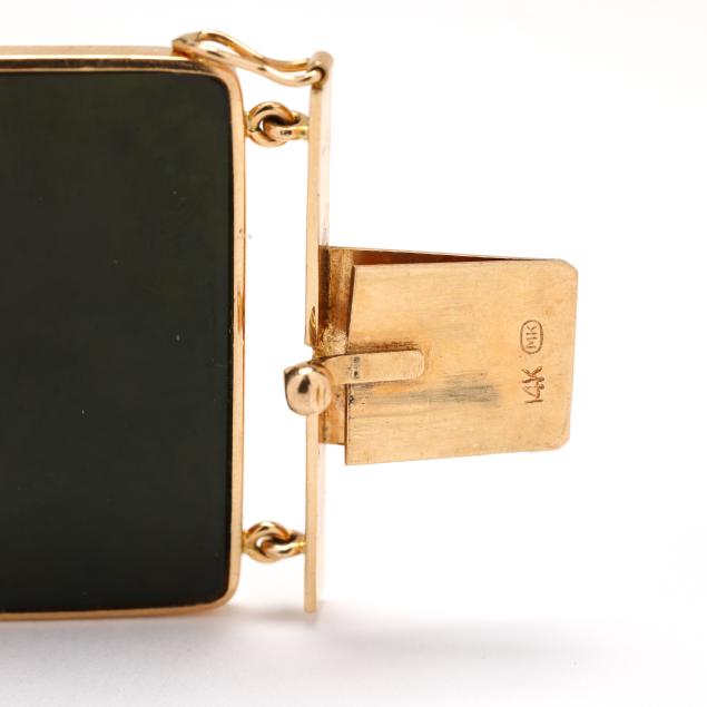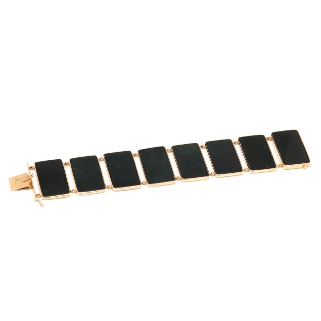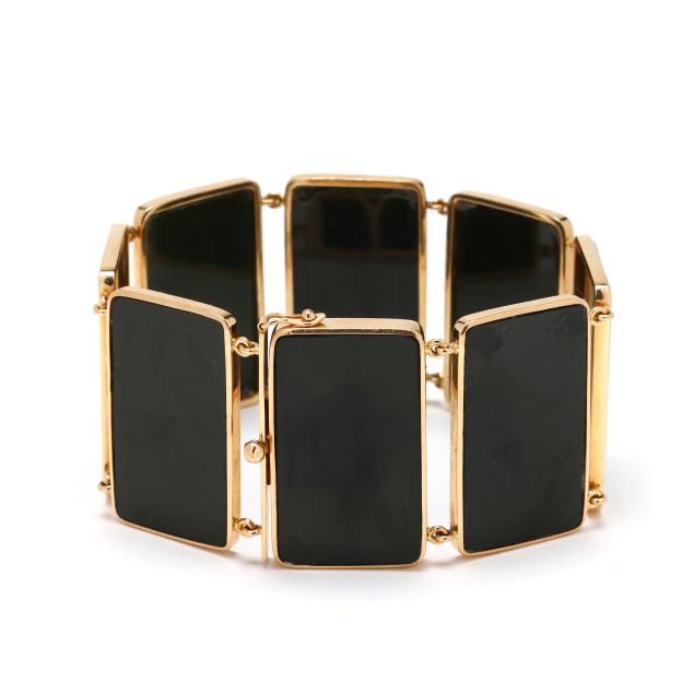 The gold bracelet consisting of eight bezel set rectangular nephrite jade tablets (32 x 19mm), completed with a box clasp and figure eight safety, stamped 14K MK.