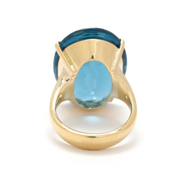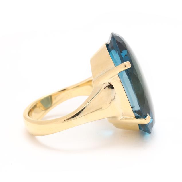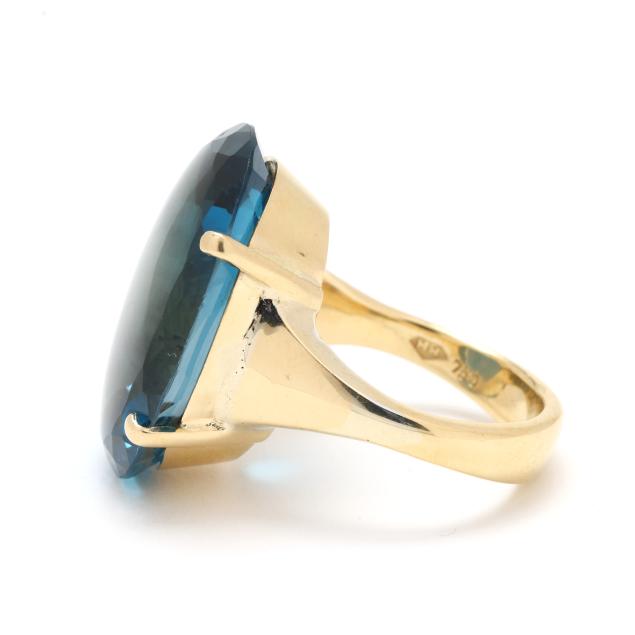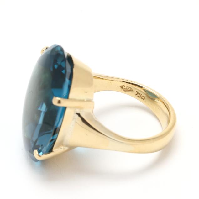 Centered on an oval cut buff top blue tourmaline (23 x 17 x 9.4mm), prong set on a tapering shank, stamped 750 and with maker's mark HH.