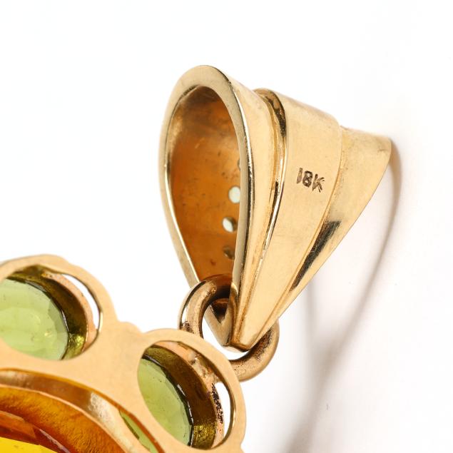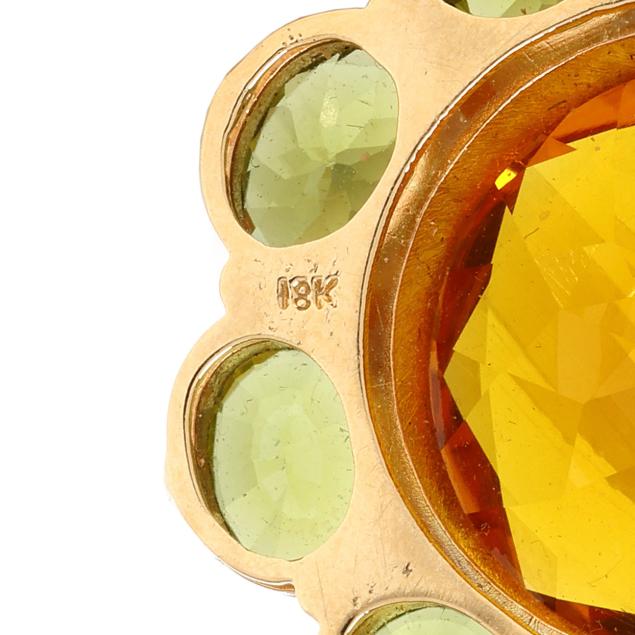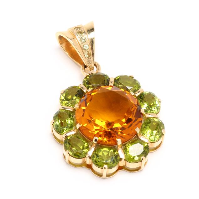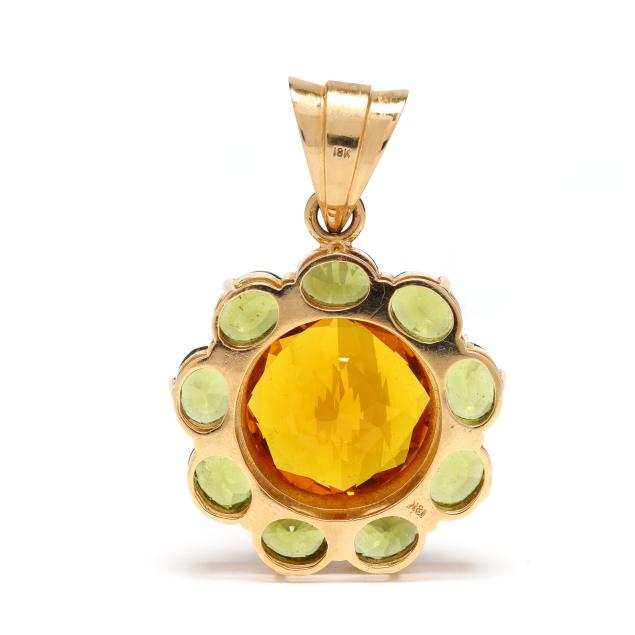 The flower motif pendant centered on a round cut citrine (20mm) weighing approximately 19.50 carats within a surround of oval cut peridot (8.5 x 6.5mm) weighing approximately 15.75 carats, completed with a bail set with peridot (2mm), stamped 18K, XRF testing 17KT.