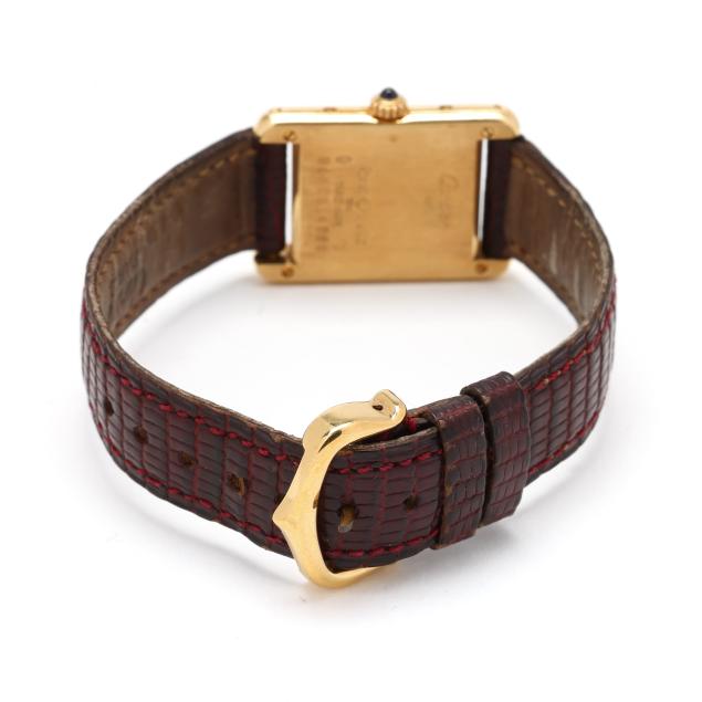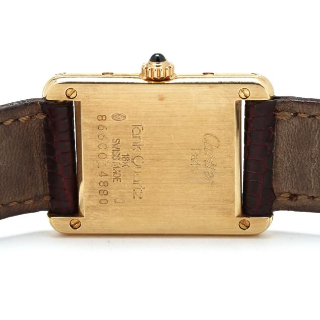 Circa 1986, quartz, Cartier 157, reference number 5365, serial number 8660014880, the rectangular gold Tank case with polished bezel, the signed white dial with black Roman numeral hour markers and blued steel sword hands, the textured brown leather strap signed Cartier completed with a gold-tone buckle, the caseback signed, numbered, and stamped 18K.