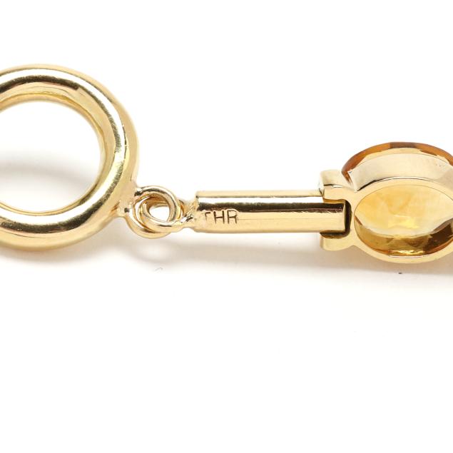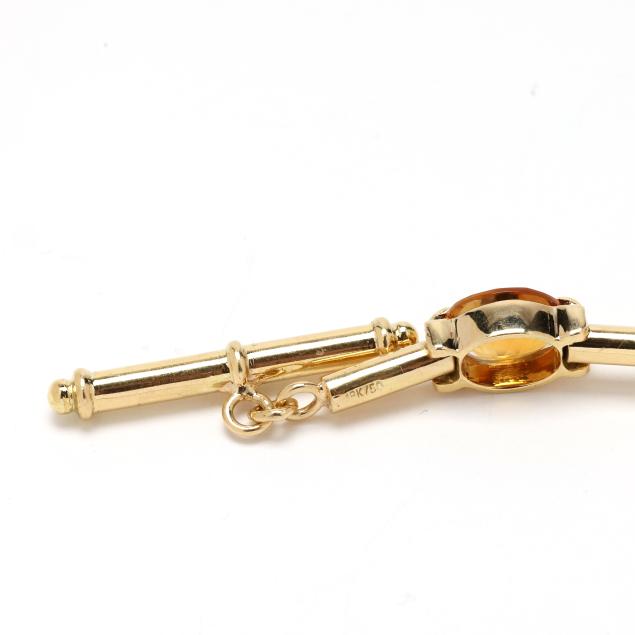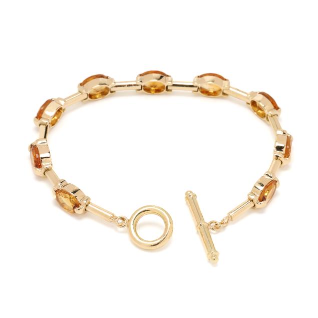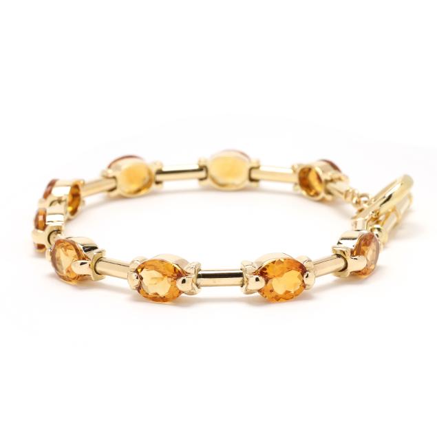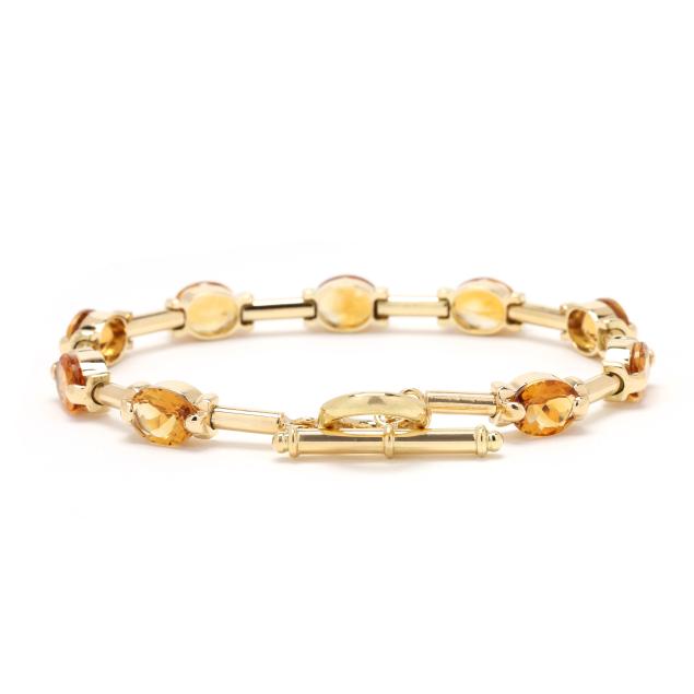 Gold bar link bracelet set with nine oval cut citrines (9 x 7mm) weighing approximately 15.0 total carats, completed with a toggle clasp, stamped 18K 750 and with mark HR.