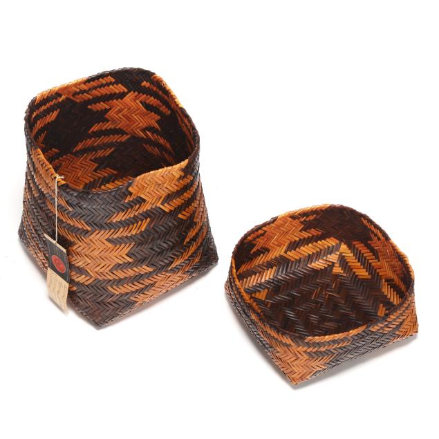 Cherokee basketry often involved the entire family. Rowena Bradley’s father, Henry Bradley, Principal Chief of the Eastern Band, and her brother Jim, participated by gathering rivercane and digging roots for dye materials. Still in most cases the actual weaving of baskets was executed by the women in the family. Rowena Bradley, her sister Ellen Arneach, their mother, Nancy George Bradley (1881-1963), and their grandmother, Mary Dobson (b. circa 1857) were all basket weavers.