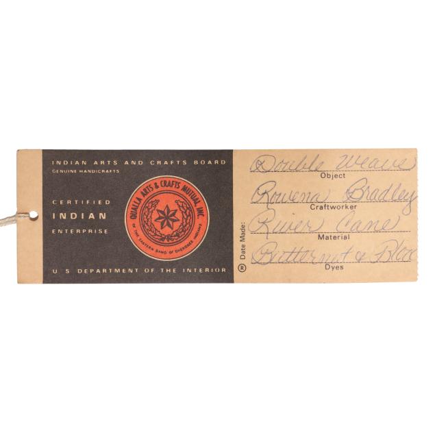 Swimmer Branch Painttown Community, double weave rivercane with butternut and bloodroot dyes, of tall rectangular form and featuring the Flowing Water (or Flowing River) design, retaining Qualla Arts and Crafts tag listing the craftworker.