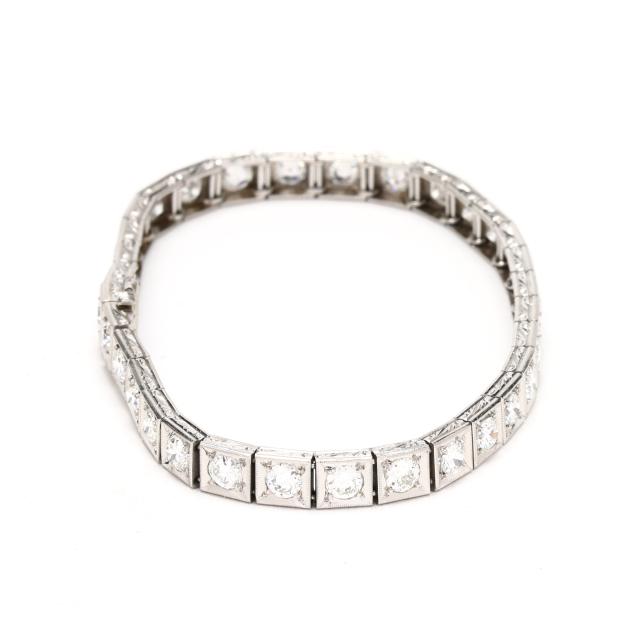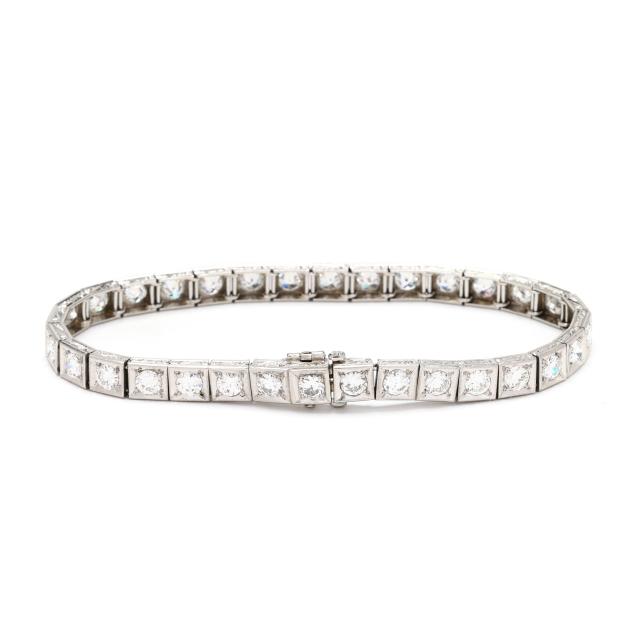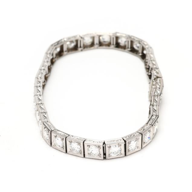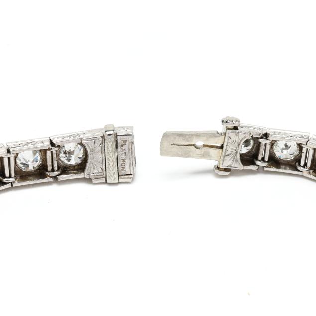 Each link with milgrain details and scrolled engraving to sides, set with transitional cut diamonds weighing approximately 5.50 total carats (F-G color, VS2-SI1 clarity), completed with an integrated box clasp and fold under safety, stamped Platinum.