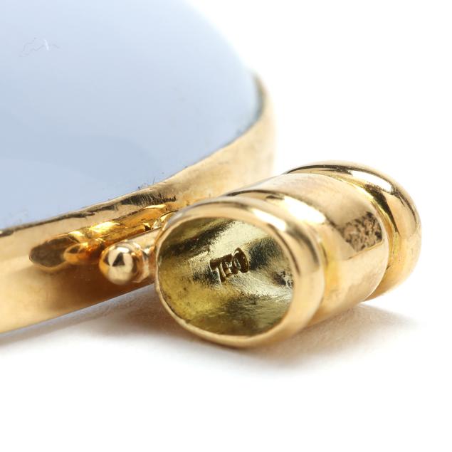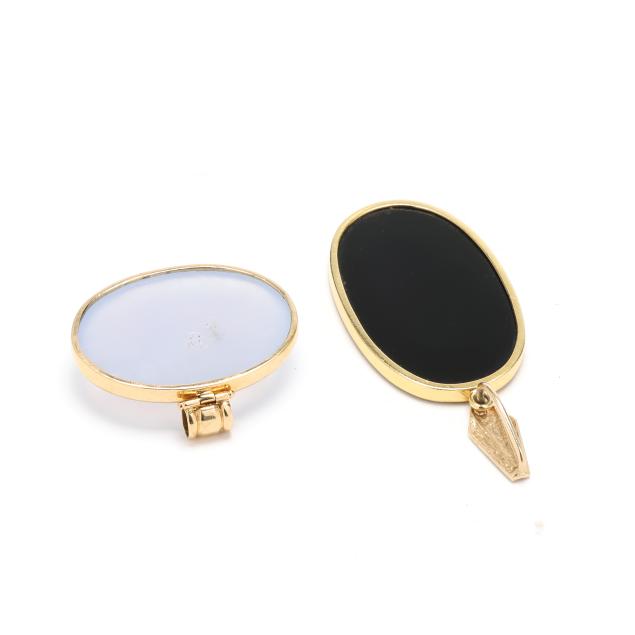 To include: a pendant bezel set with an oval tablet cut black onyx (50.0 x 30.0 x 3.2mm), completed with a trefoil motif bail, bezel XRF testing 18KT, bail XRF testing 14KT (2 7/8 in.); and a pendant bezel set with an oval cabochon cut blue chalcedony (40 x 30 x 9mm), completed with a bail, XRF testing 18KT (1.5 x 1 5/8 in.)