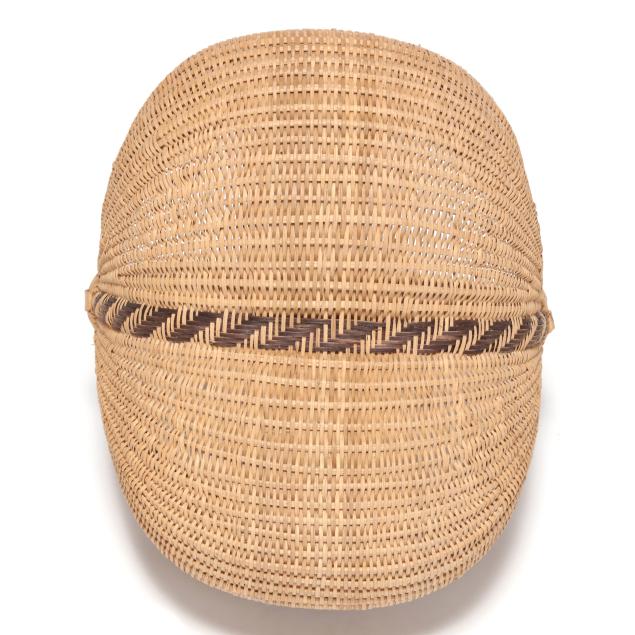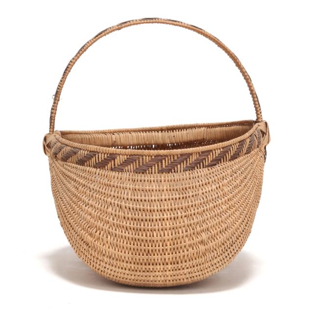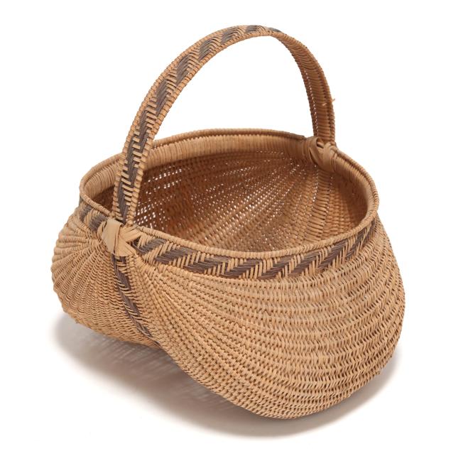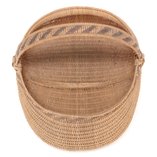 Short Mountain Woodbury, Tennessee, finely woven white oak, weavers with natural dyed handle and rim, pencil inscribed to interior "Nelda J. Merritt Stones River Rd. Short Mtn. Woodbury, Tenn. 37190".