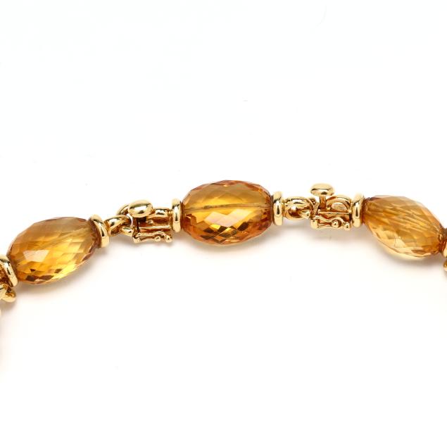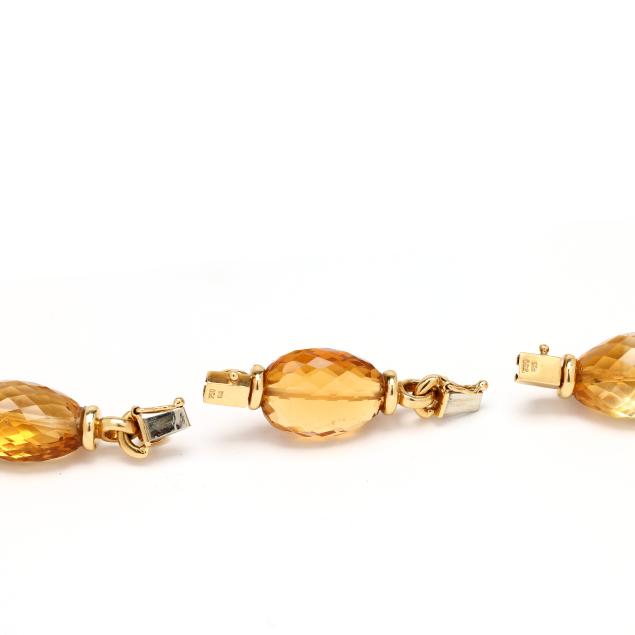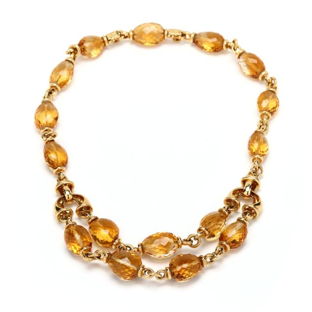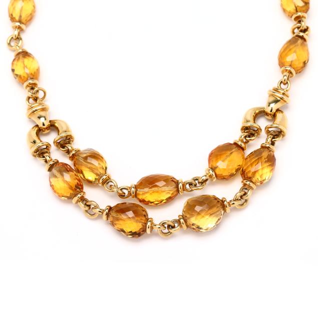 The necklace with links consisting of an oval faceted bead citrine between gold end caps, and with a double row to the center section, with one removable link, completed with box clasps and figure eight safeties, stamped 750 / 18K.