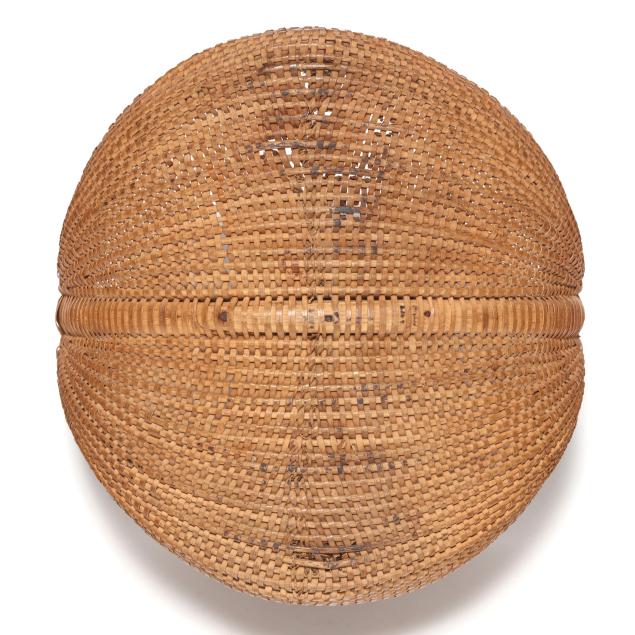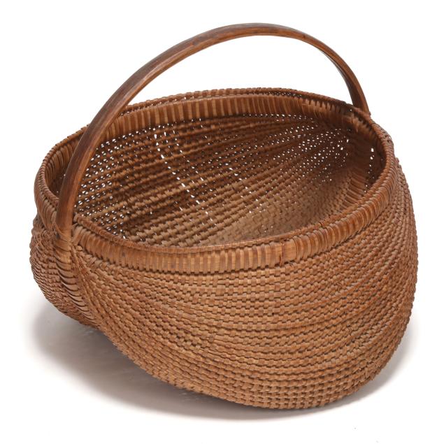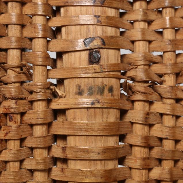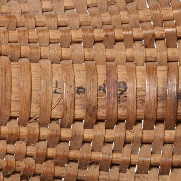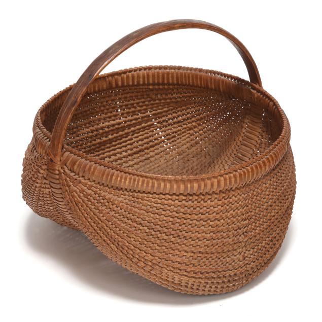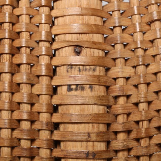 Circa 1910, finely woven in white oak splints with bentwood handle and rim, converging-rib kidney form with double wrapped rim, arched handle with X-form lashings with finishing nail, retaining original surface patina with oxidized period nails, a few inscriptions appearing to read "Long" to interior and underside center, otherwise unmarked.