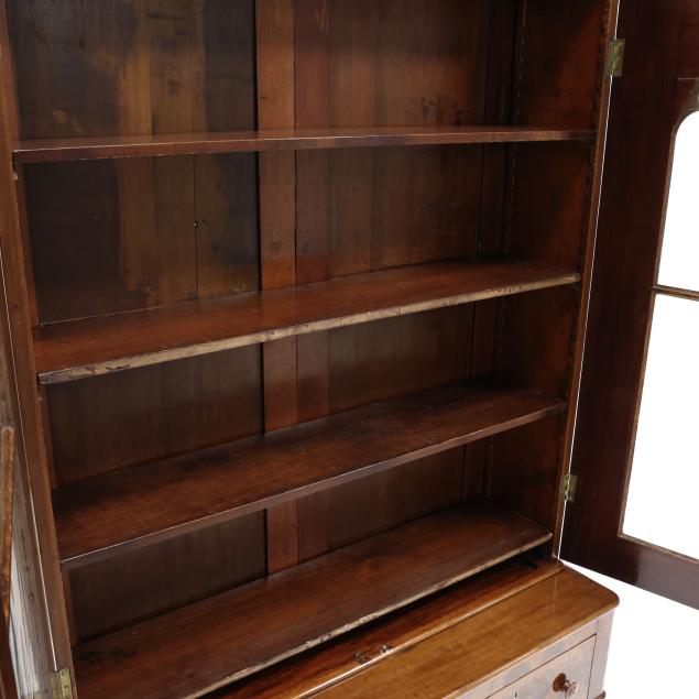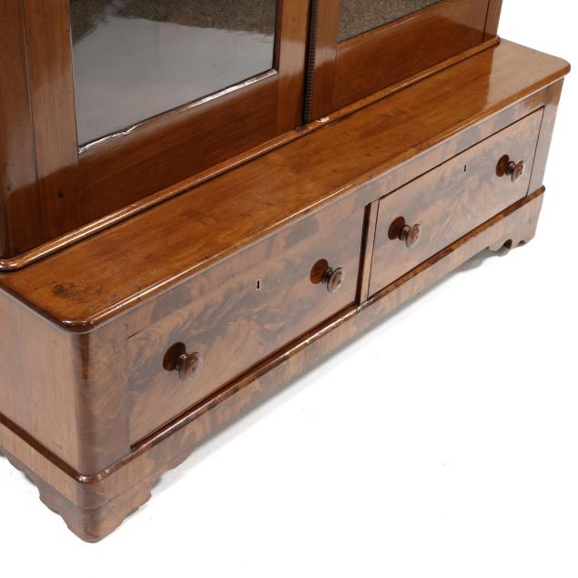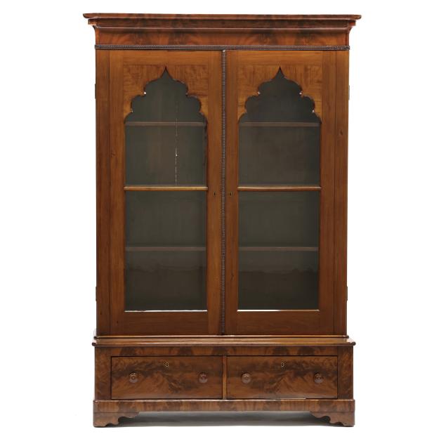 Circa 1840, mahogany, mahogany veneer, poplar and white pine secondary, multi-part form, molded cornice with applied beaded trim, two hinged glass panel doors with upper Moorish style arch and repeating beaded central stile, louvered shelf interior, projecting base with two flush drawers in flame mahogany veneers, flush sides, short bracket feet.