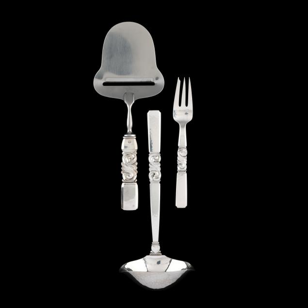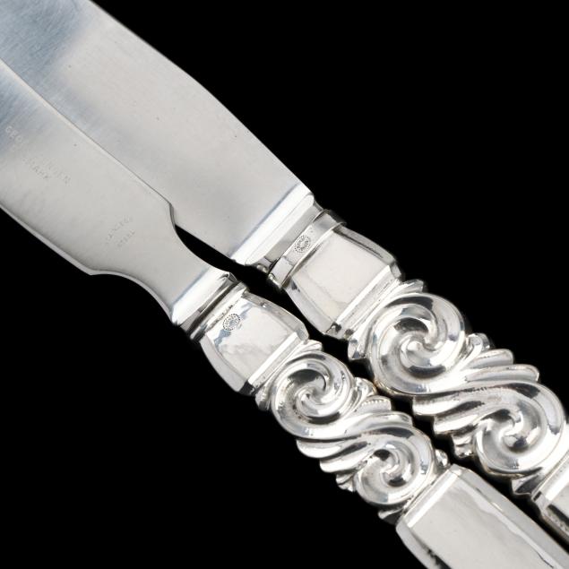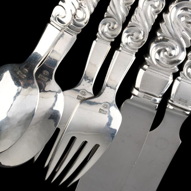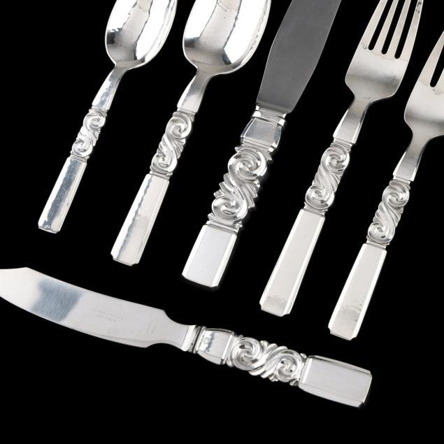 (50) pieces to include: (10) dinner knives (8 7/8 in.); (8) dinner forks (7 1/8 in.); (10) salad forks (6 3/8 in.); (7) teaspoons (5 7/8 in.); (4) oval bowl soup spoons; (8) pastry forks; a gravy ladle; a cheese peeler; and a master butter knife; not monogrammed.
