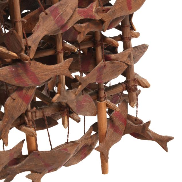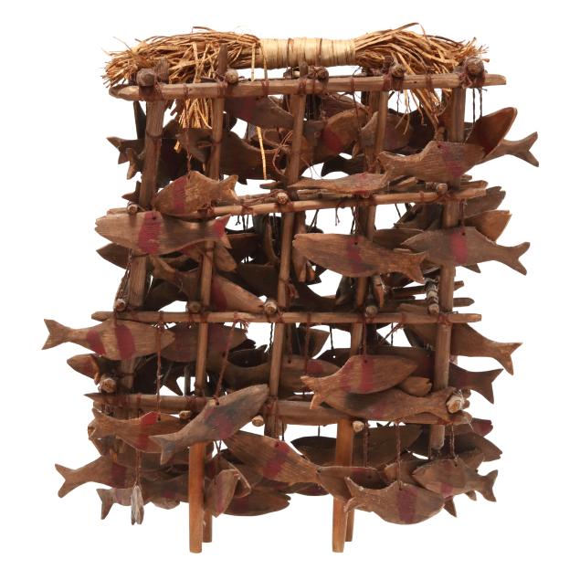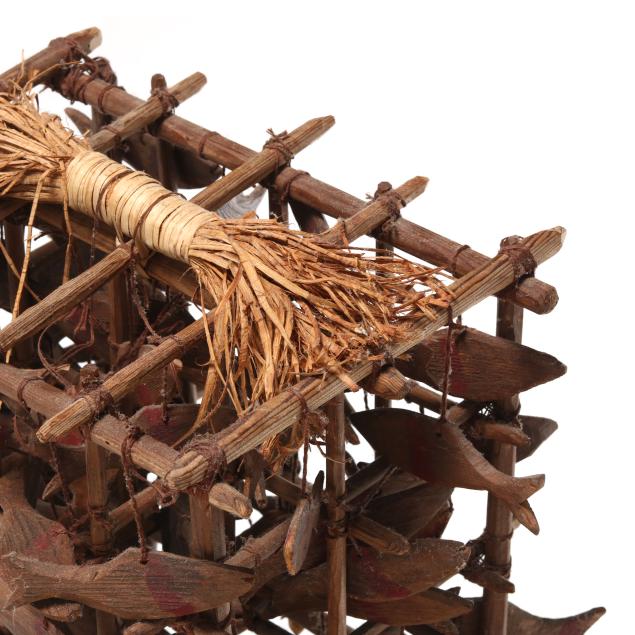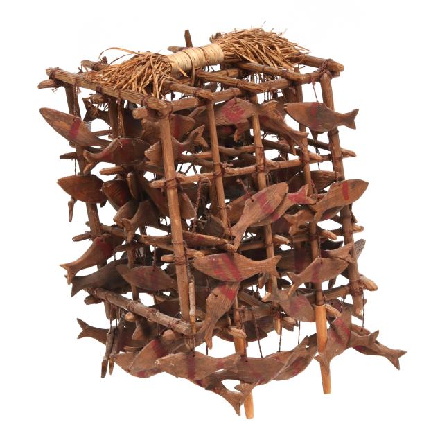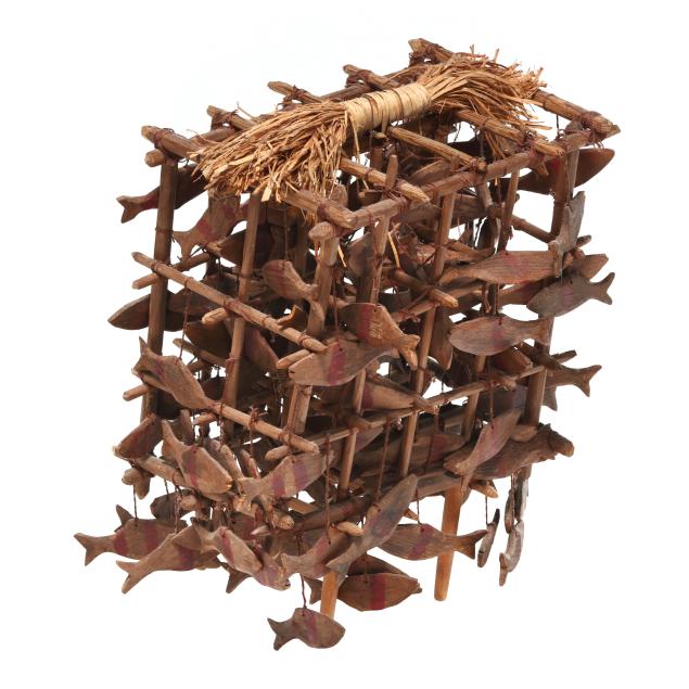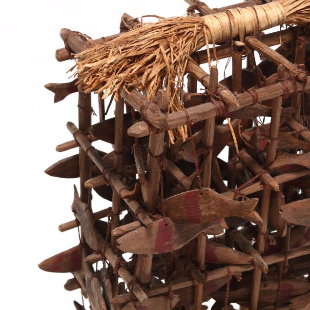 First half 20th century, possibly older, carved cedar, cedar bark, and string, unsigned, rectangular form trap constructed of cedar rods secured with cotton twine, suspending carved wood fish with painted accents, surmounted by cedar bark straps.