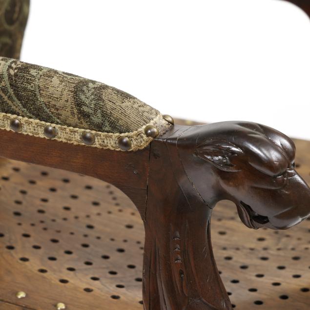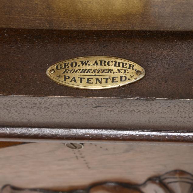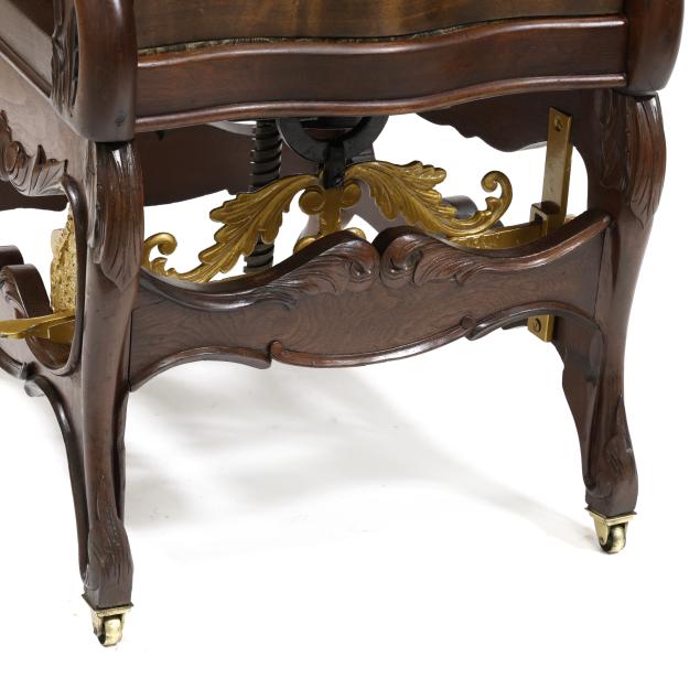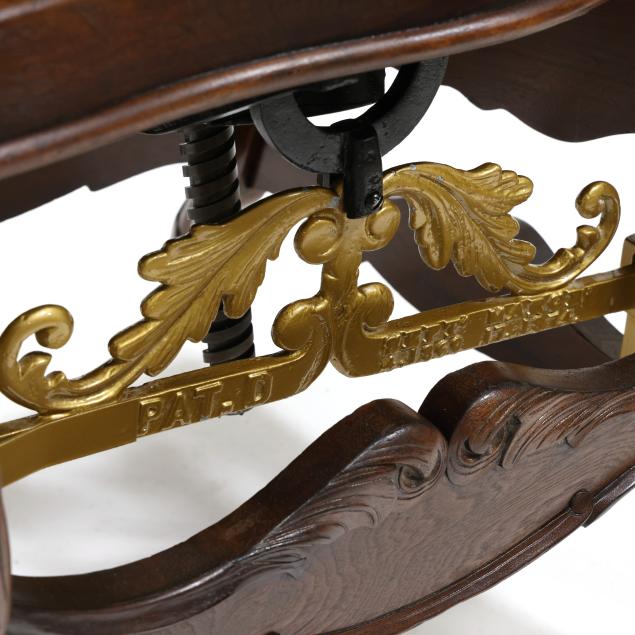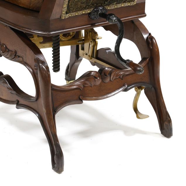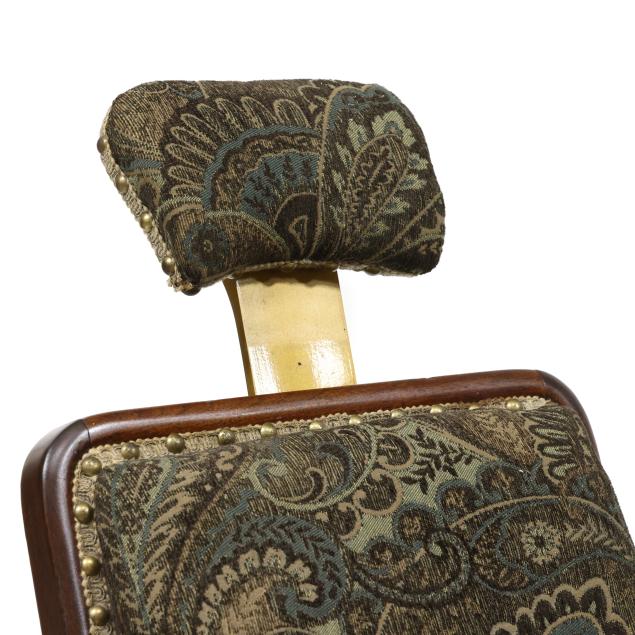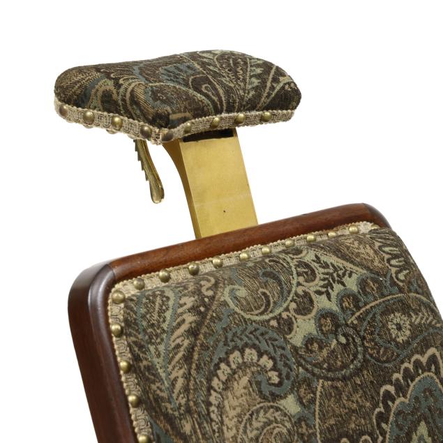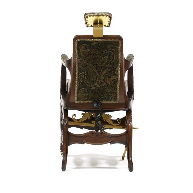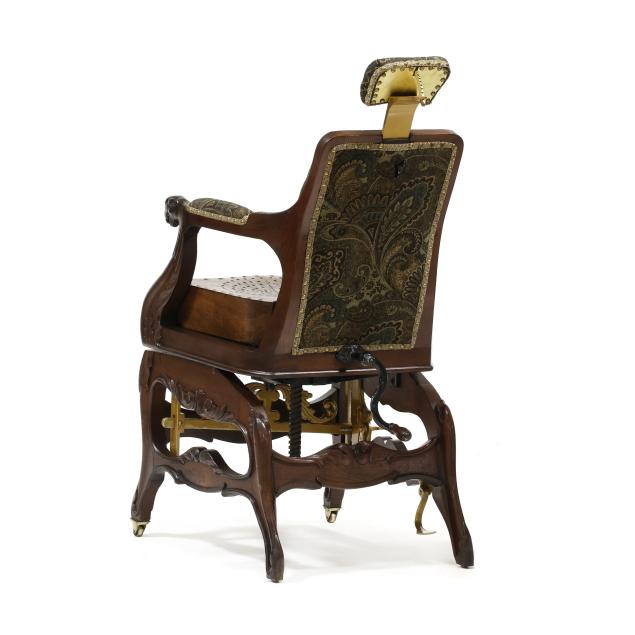 Rochester, New York, circa 1874, gold painted metal mounts, plush green paisley upholstery with brass tack trim, relief carved frame featuring dog heads to the arm terminus; adjustable height head rest and angle; adjustable height serpentine seat with pierced star motif (operated by lever at the lower back side) with faint illegible stamp at rear center edge; front left side and rear with seat angle adjustment levers, brass oval plaque to left seat rail "Geo. W. Archer, Rochester, N.Y., Patented" and the front iron rail marked "Pat'd Setp. 4, 1860 / March 17, 1874" and further marked to the left iron panel.