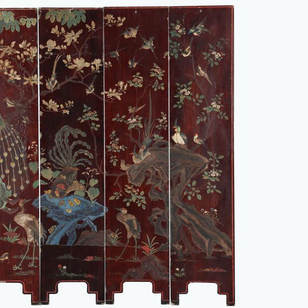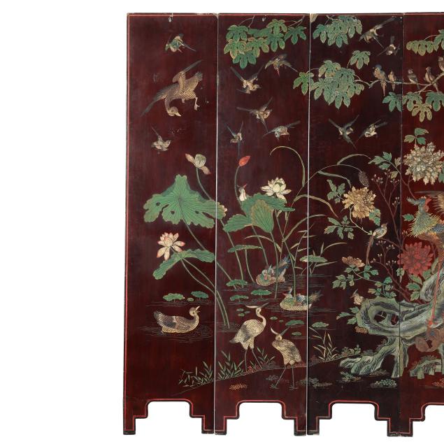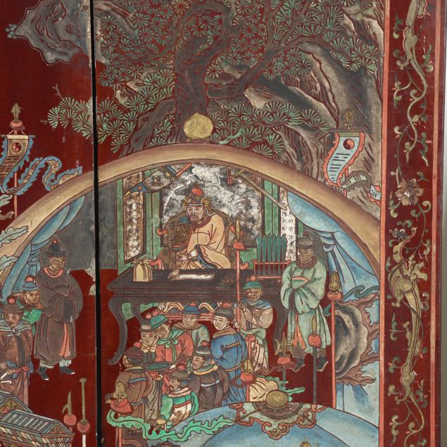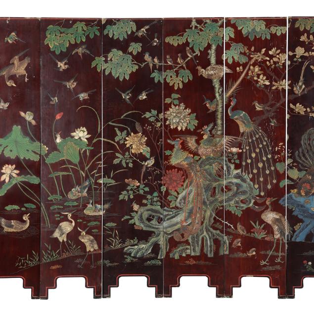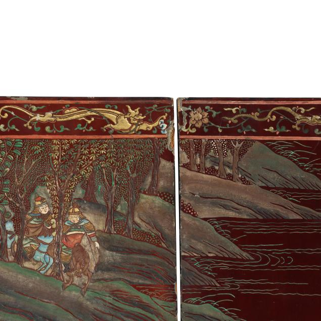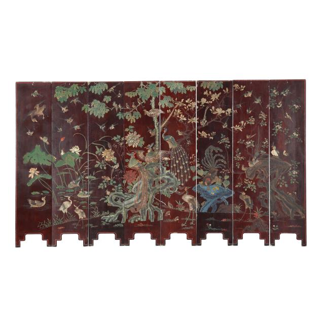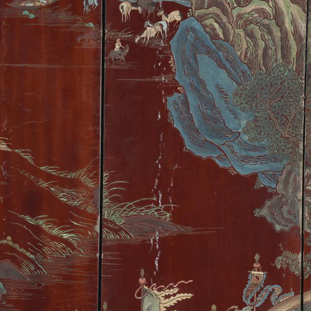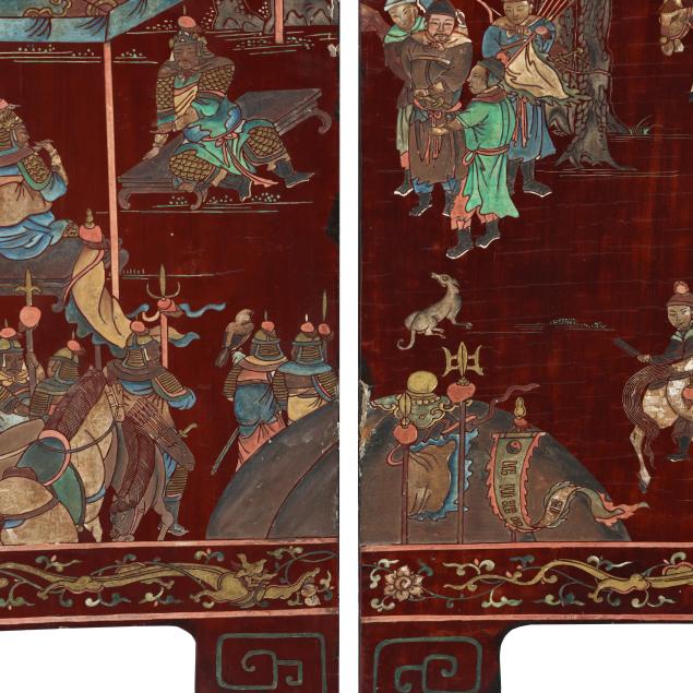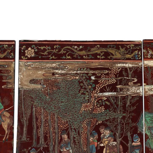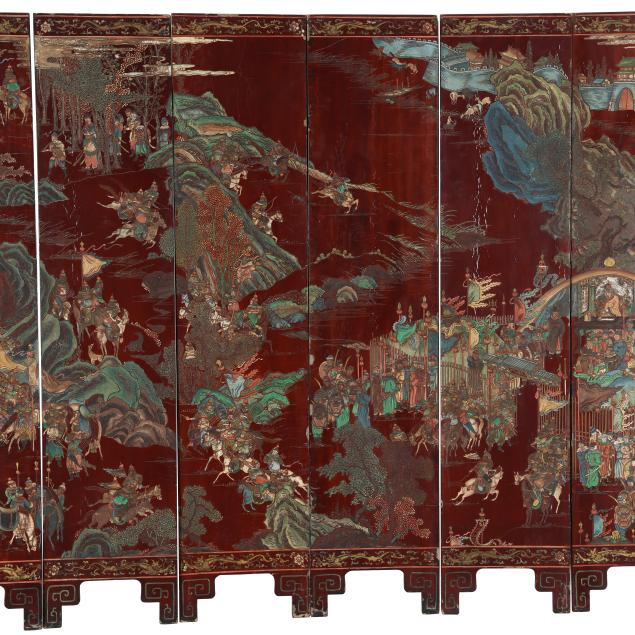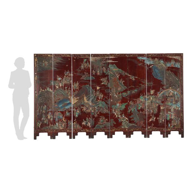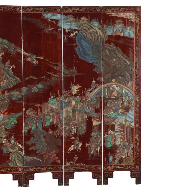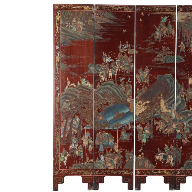 Qianlong period (1736-95), a very well carved eight panel screen lacquered dark reddish brown and painted with bright pigments, especially nice are the blues and greens, the front side of the screen has an immense and very detailed military campaign scene in a mountainous landscape, a gold