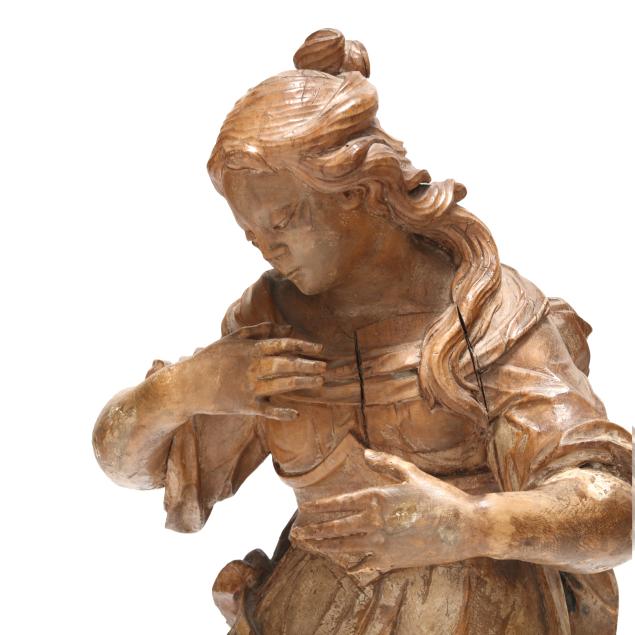 Carved wood (likely limewood), with traces of gesso and polychrome, underside retaining worn round ink stamp "...Salzburg", rendered as a kneeling saintly female figure, possibly Mary Magdalene, gazing down and gesturing in flowing robes.