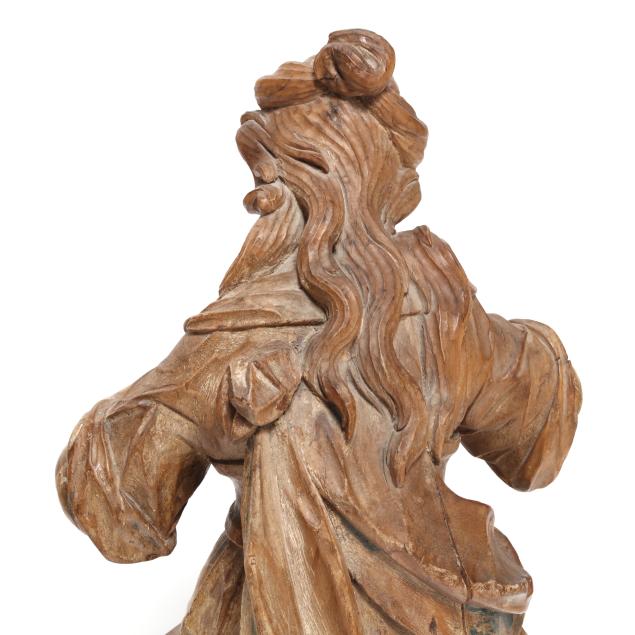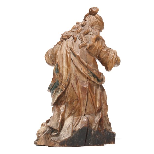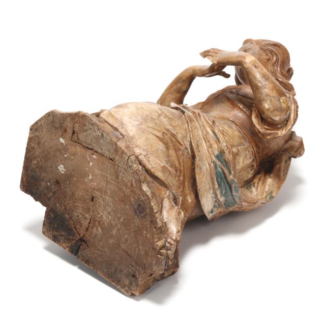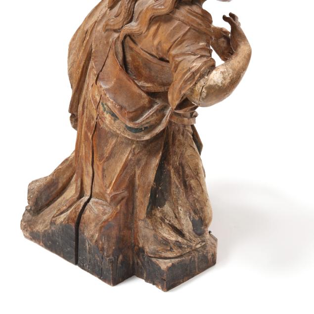 From the Collection of Kayvon North, Raleigh, North Carolina Age check to wood; losses to paint and gesso; some edge chips; losses to fingers and arms with some areas of repair.
