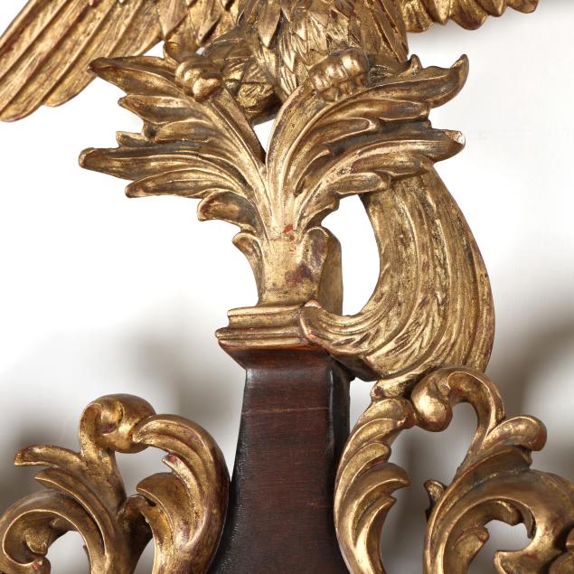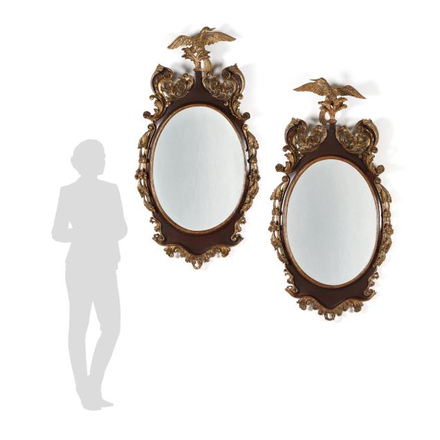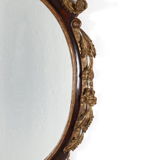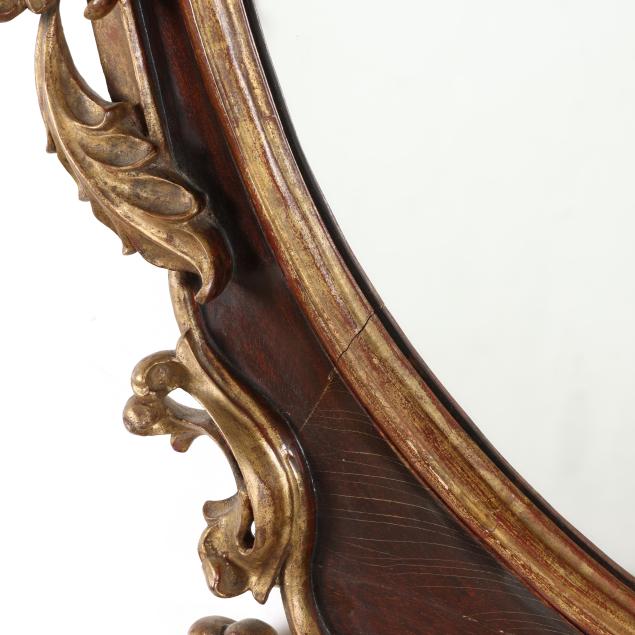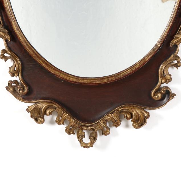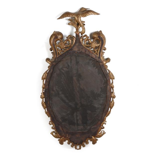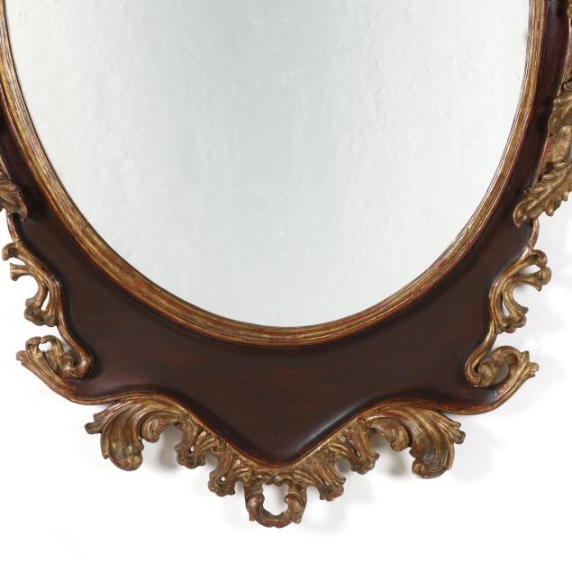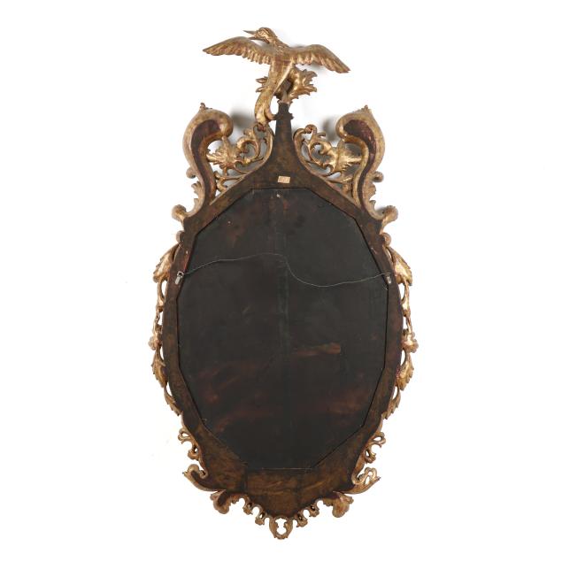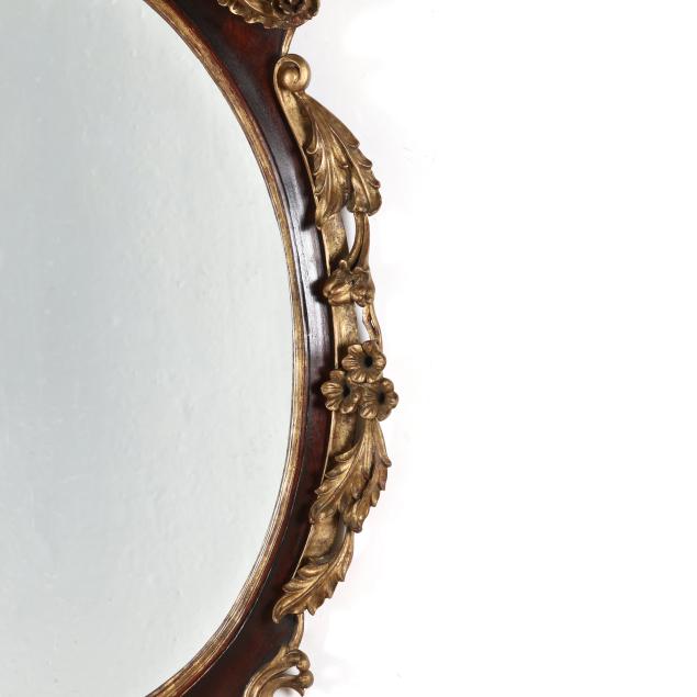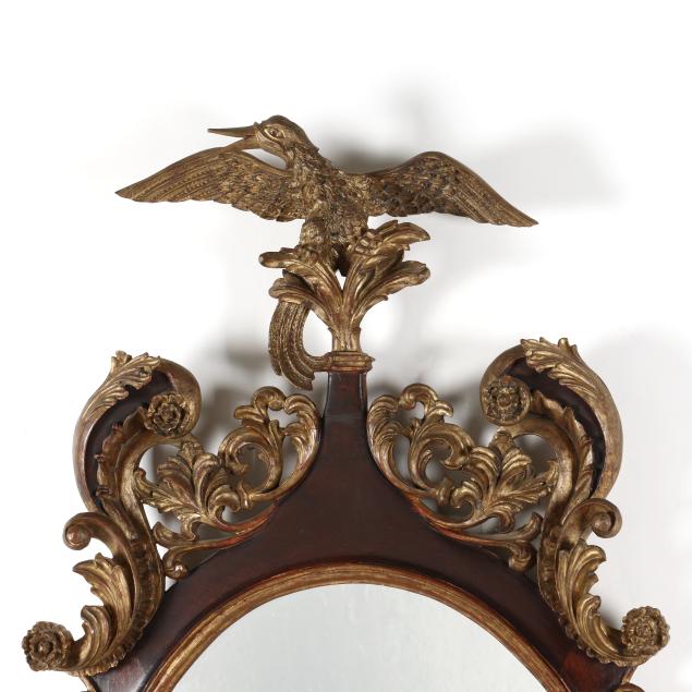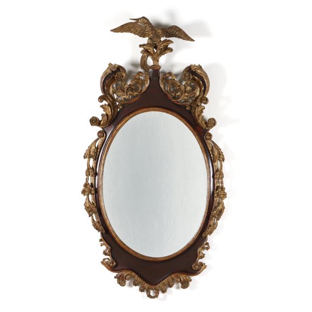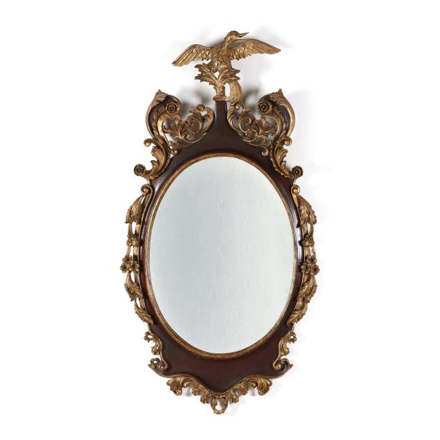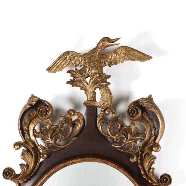 First half 20th century, oval mirror with molded surround, relief carved edge with acanthus leaf and bellflowers, open scroll work pediment surmounted by facing spread winged hoho birds.