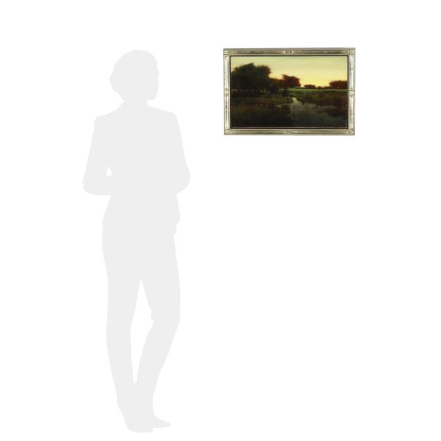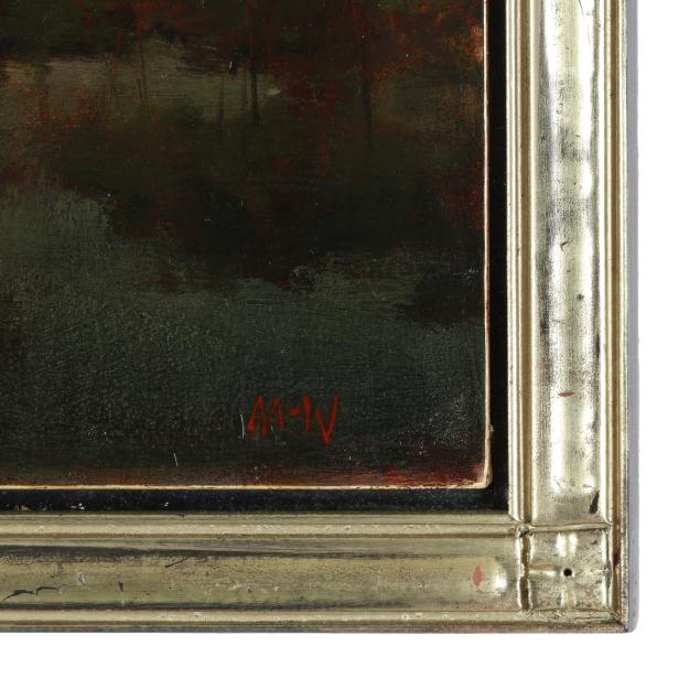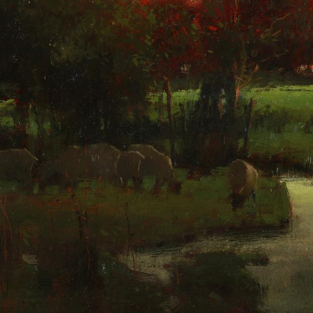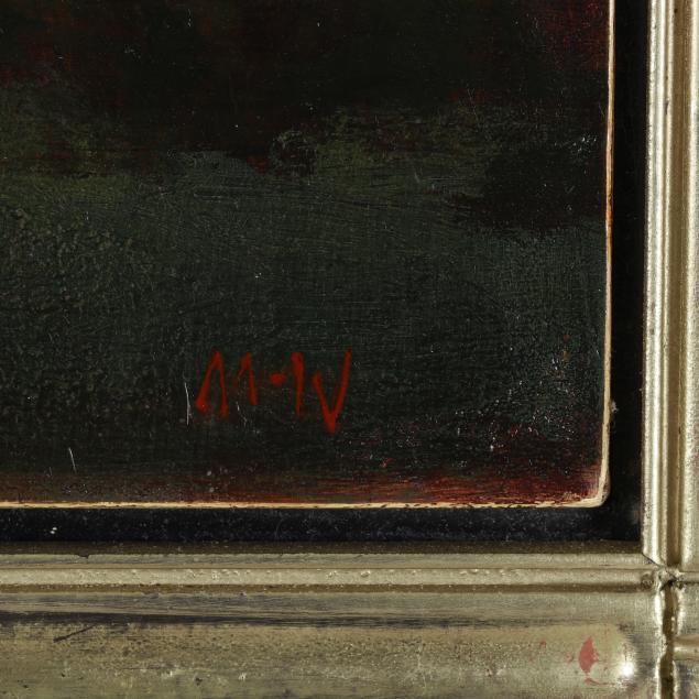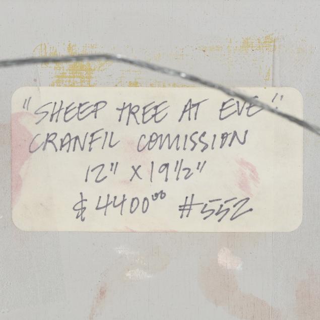 Oil on board, monogrammed "MW" to the lower right, with label to the verso "Sheep Tree At Eve" / Cranfil Comission [sic]", presented in a carved giltwood frame.
