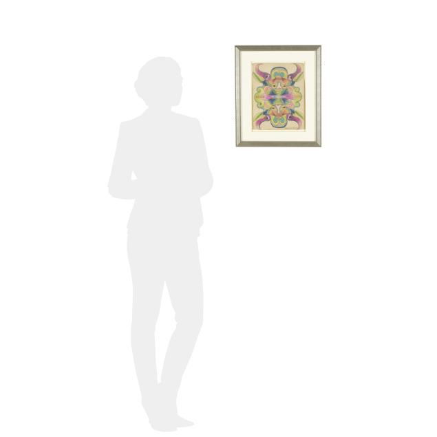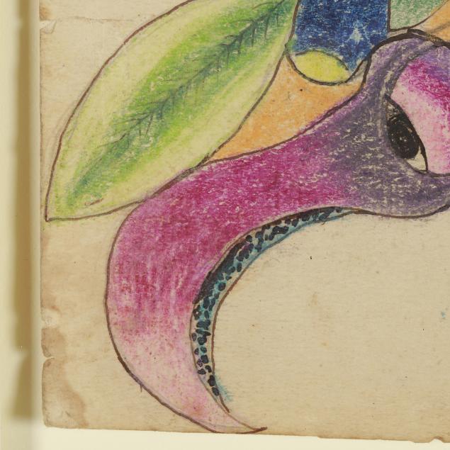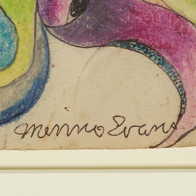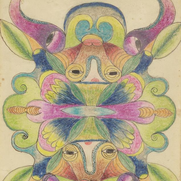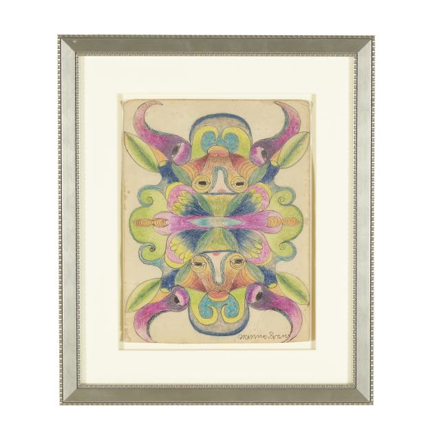 Minnie Evans was a self-taught African American artist renowned for her vivid, visionary drawings that blend religious symbolism, natural motifs, and dreamlike imagery. Born in Long Creek, North Carolina, and raised in Wilmington, Evans began creating art in 1935 after experiencing a spiritual vision that compelled her to draw. Her works, rendered in wax crayon, pencil, and later oil and collage, are characterized by symmetrical compositions featuring faces, eyes, flowers, and fantastical creatures. Evans drew inspiration from her deep Christian faith, ancestral stories, and the lush surroundings of Airlie Gardens, where she worked as a gatekeeper, a role that allowed her to sell her art directly to visitors.