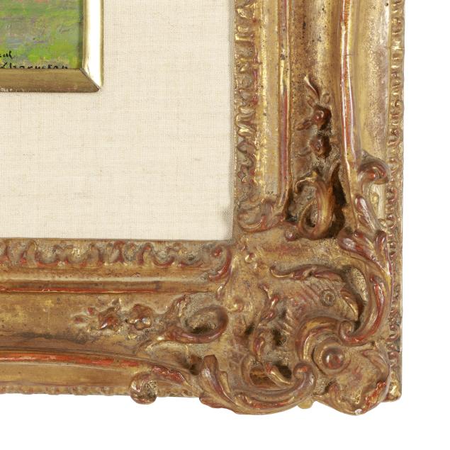 Oil on board, signed and dated at lower right, retaining gallery labels to verso, presented in a carved giltwood frame