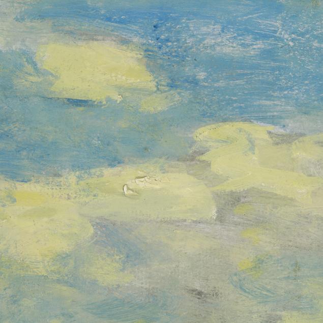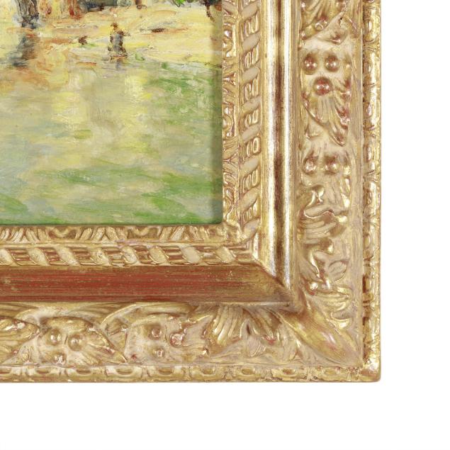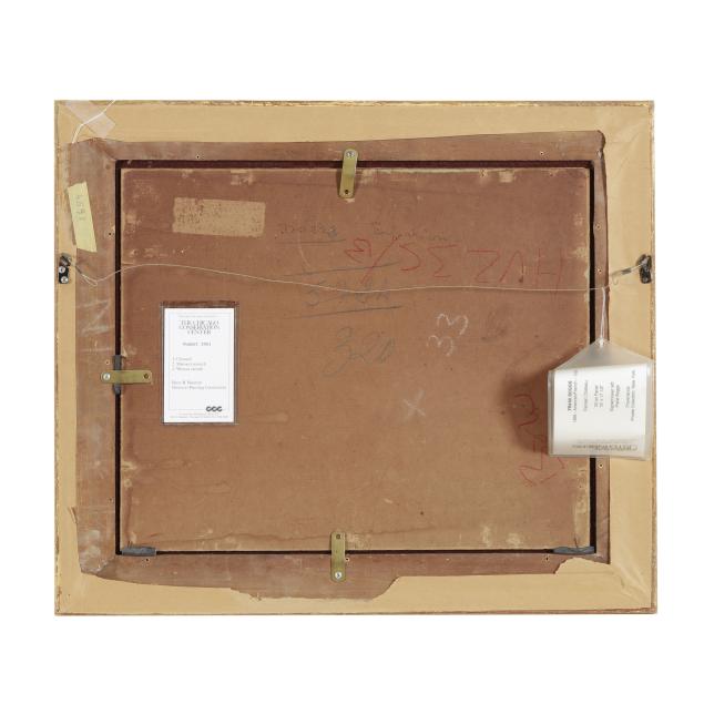 Oil on masonite, signed at lower left, retaining gallery paperwork and conservation label, presented in a carved giltwood frame.
