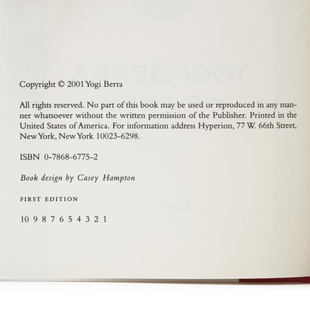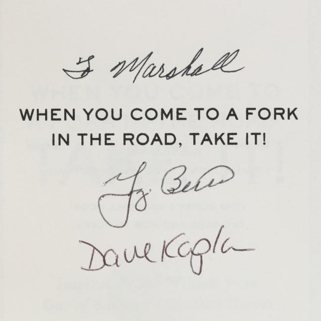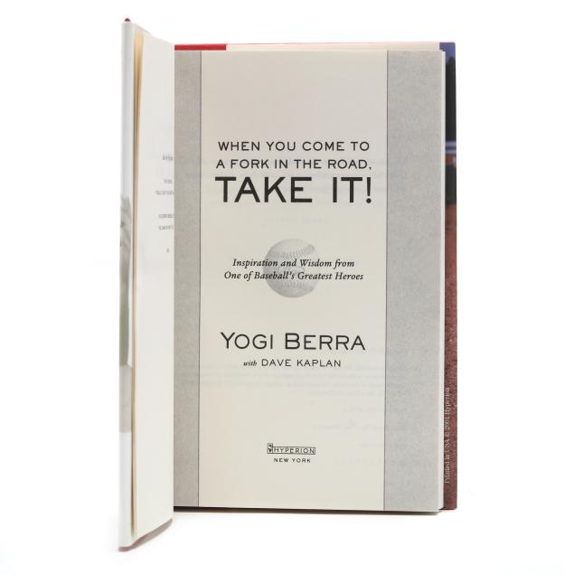 Yogi Berra; Dave Kaplan. WHEN YOU COME TO A FORK IN THE ROAD, TAKE IT! INSPIRATION AND WISDOM FROM ONE OF BASEBALL'S GREATEST HEROES. New York: Hyperion, [2001]. Stated first edition with full number line. Inscribed on the half-title with the signature of both Yogi Berra and Kaplan. Hardcover. Red cloth-backed paper-covered boards with silver lettering on the spine; in unclipped dust jacket. Small 8vo; 175pp.