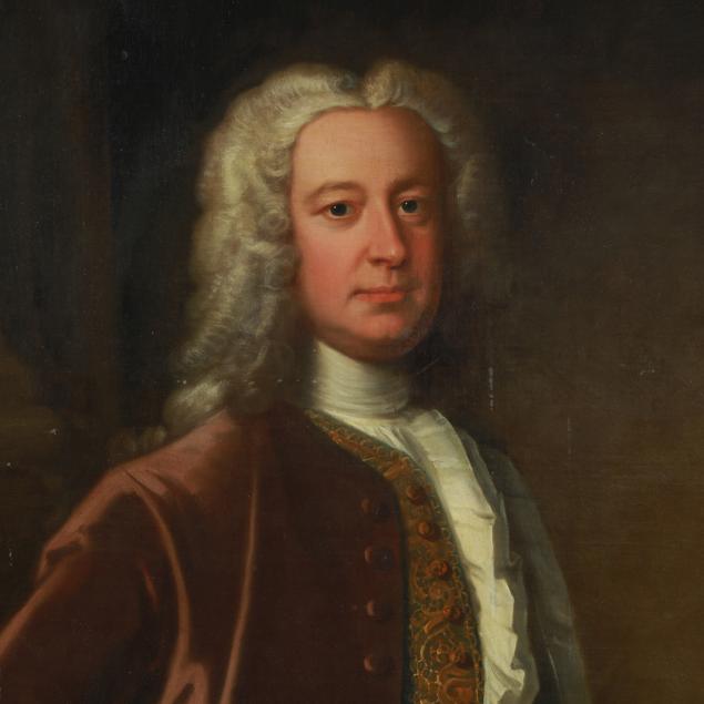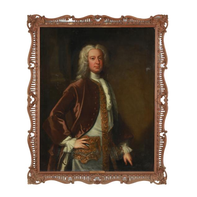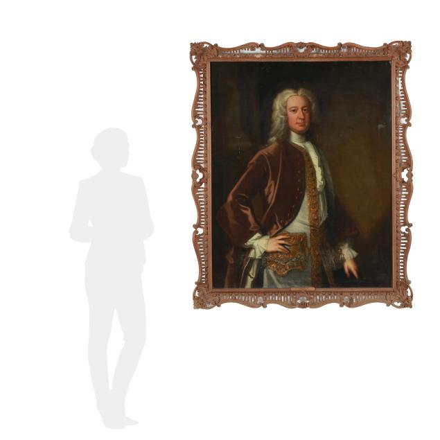 In the 18th century, English portraits of aristocracy emphasized wealth and power. This sitter is depicted wearing a full wig along with a gilt embellished blouse and brown waistcoat, elements which signified nobility, high social rank, and alignment with courtly styles.