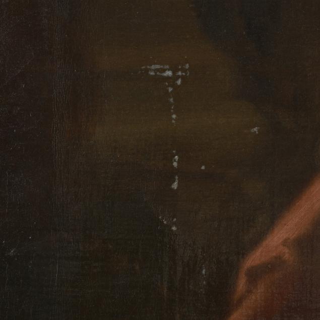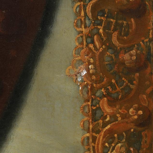 Painting has age cracking, puncture to the center with light associated looses, has been lined, with restoration and retouching, stretcher lines, and significant losses to the frame.