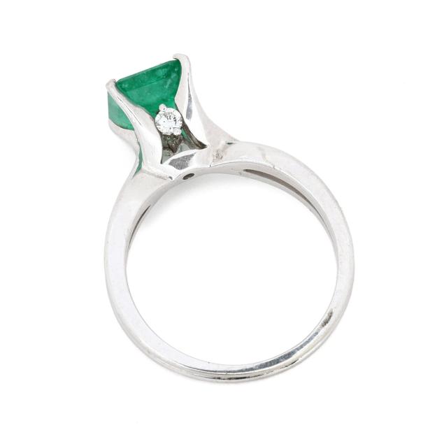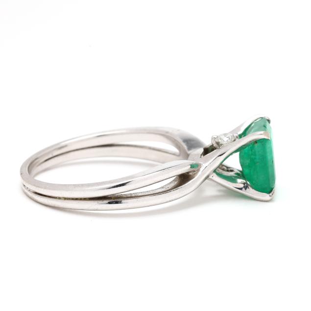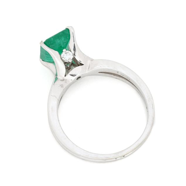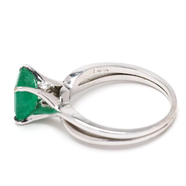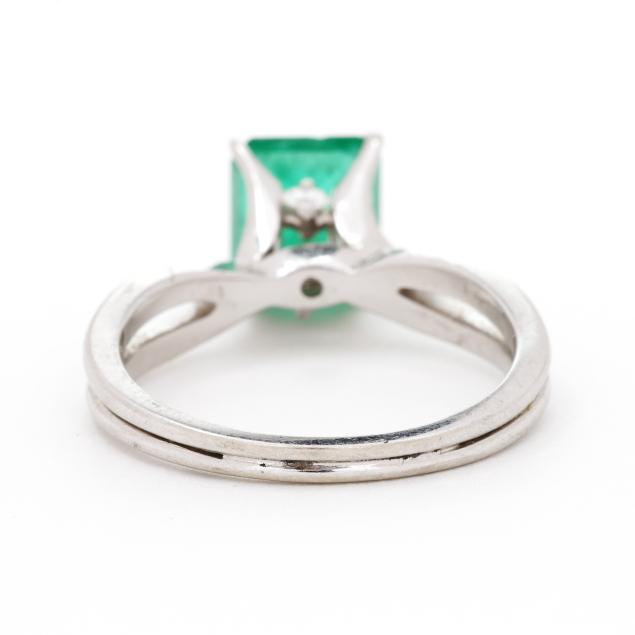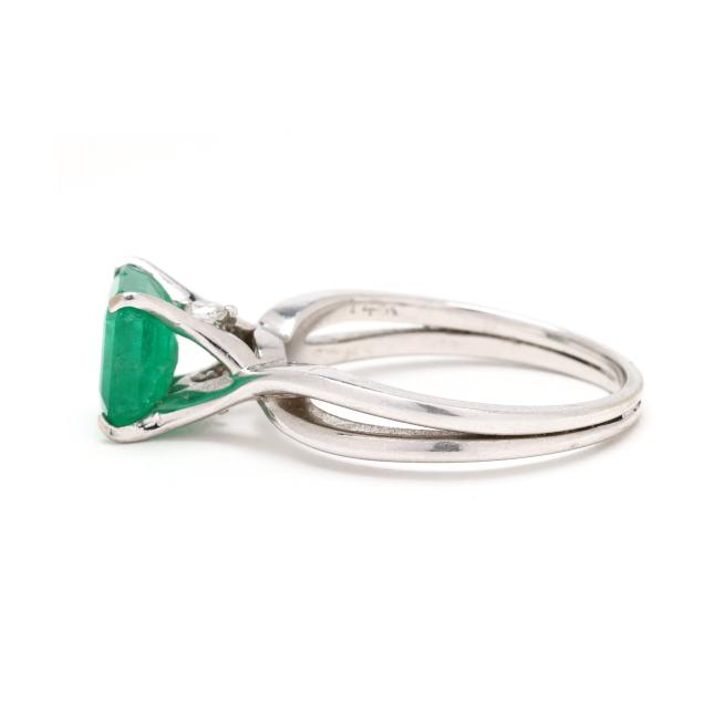 Centered on an emerald cut emerald (7.84 x 7.37 x 4.10mm) weighing approximately 1.75 carats, set to the gallery with full cut round diamonds (2.25mm) weighing approximately .08 total carat (I-J color, SI1-SI2 clarity), completed with a split shank, stamped 14K.