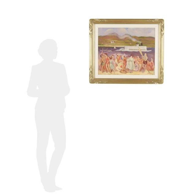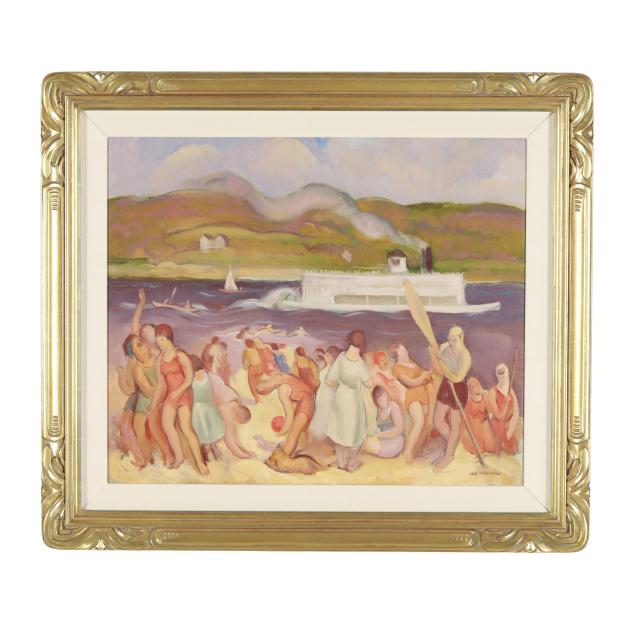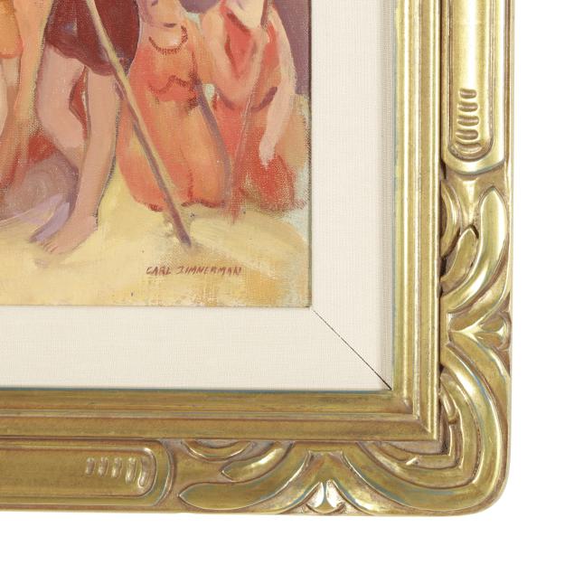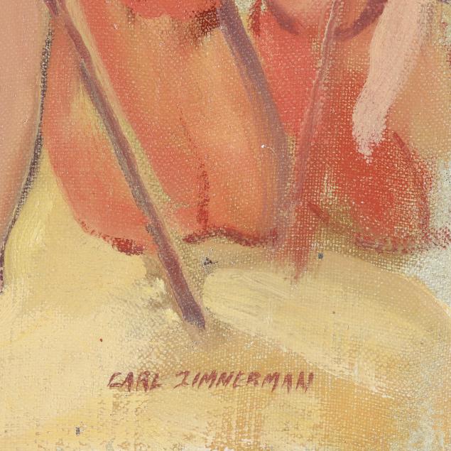 From a Private Collection, Frankfort, Kentucky Carl John Zimmerman was a Cincinnati artist known for his mural painting, oil painting, and teaching. Born in Indianapolis, he studied art at Manual Training High School and the John Herron Art Institute under Otto Stark. In 1919, he studied teaching at the American Academy of Art in Chicago, and in 1925 enrolled at the Cincinnati Art Academy, studying under Reginald Grooms, John E. Weis, and Herman Wessel. In 1927, he received his first mural commission and spent a year and a half traveling throughout Europe with his wife Carolyn.