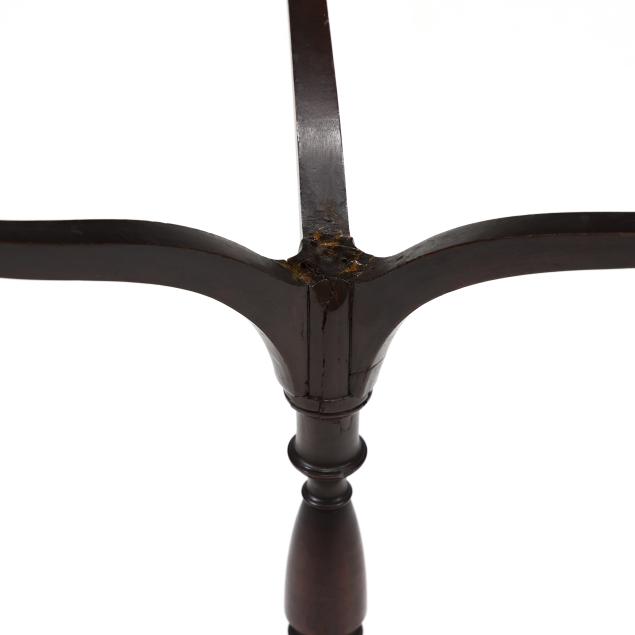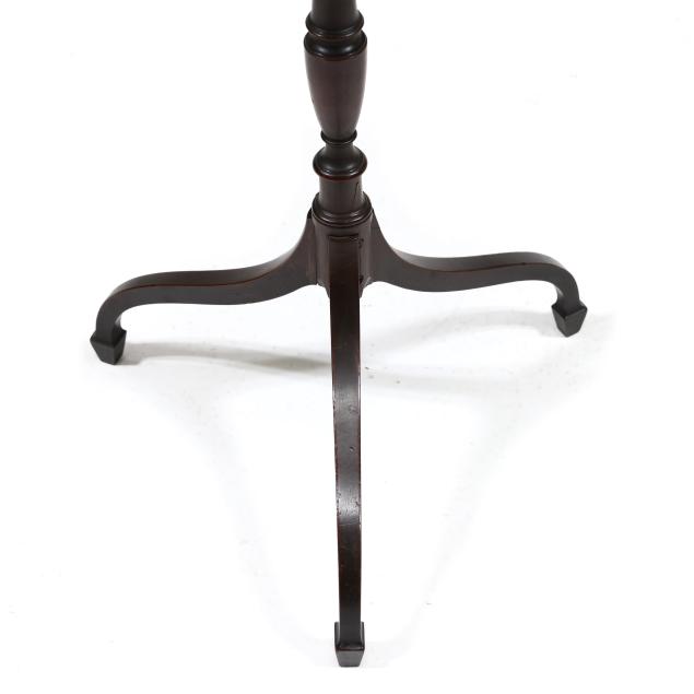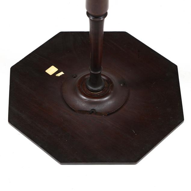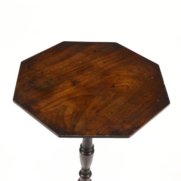 Circa 1800, octagonal top, delicate urn turned standard, tall tripod base, spade foot.