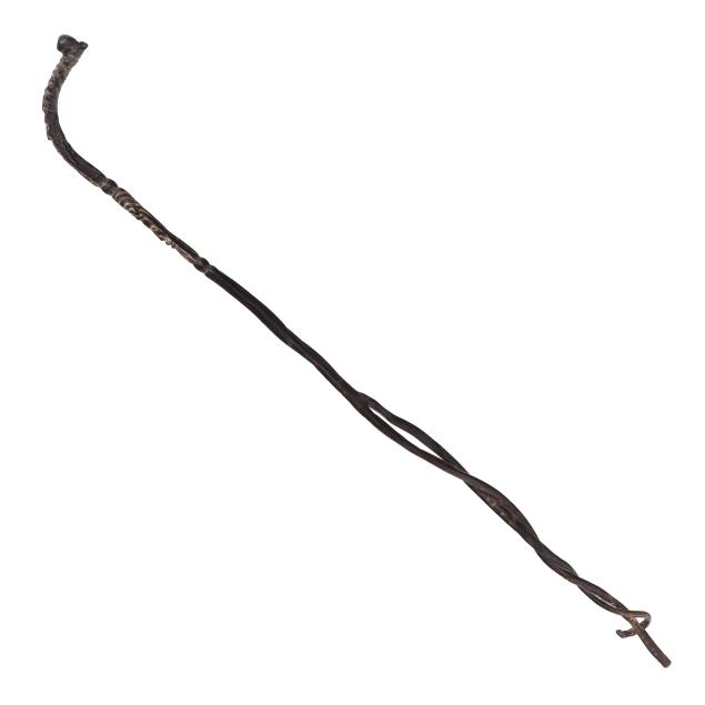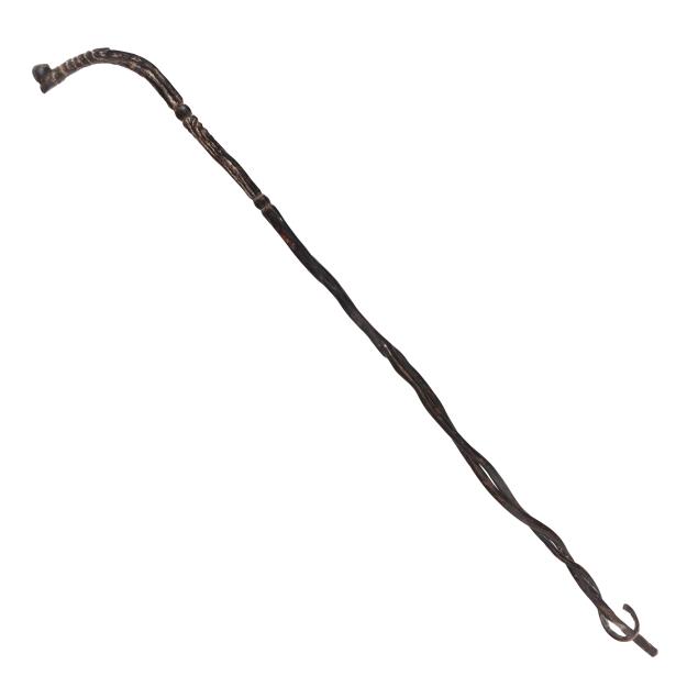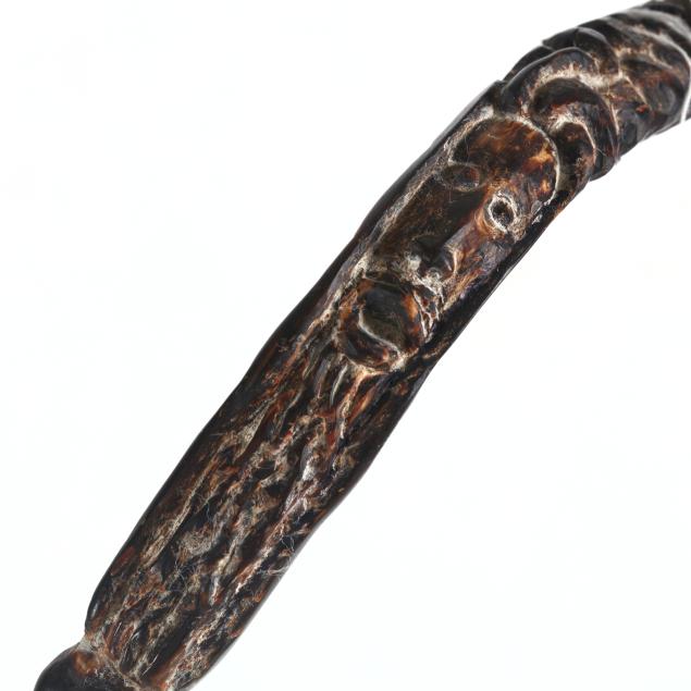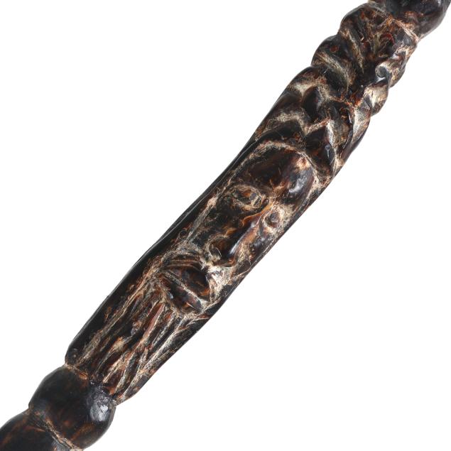 Caribbean, natural black coral, single long specimen, with carved handle, the upper half carved with stylized human masks, above a natural branching lower shaft, unsigned.