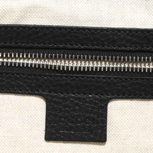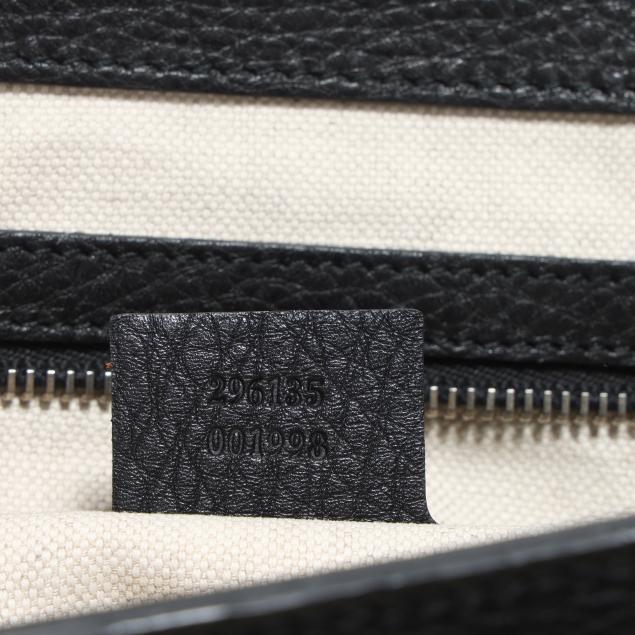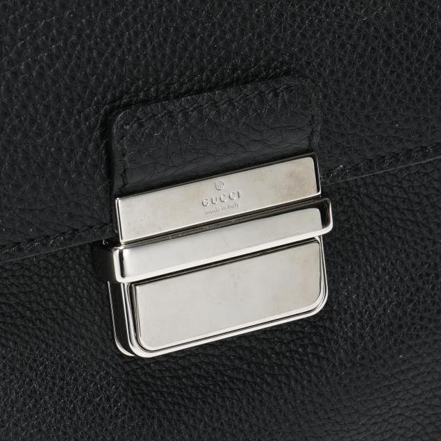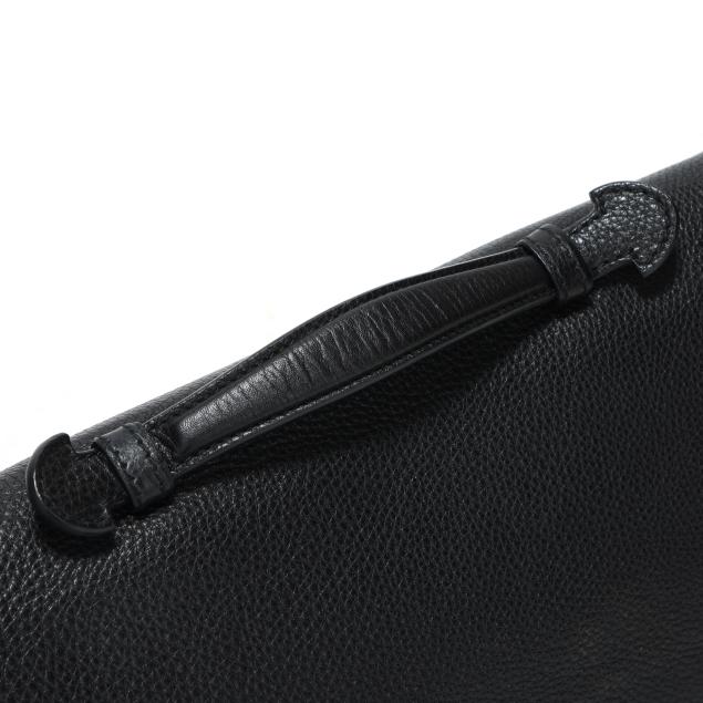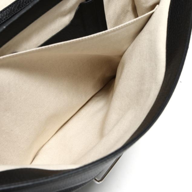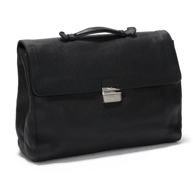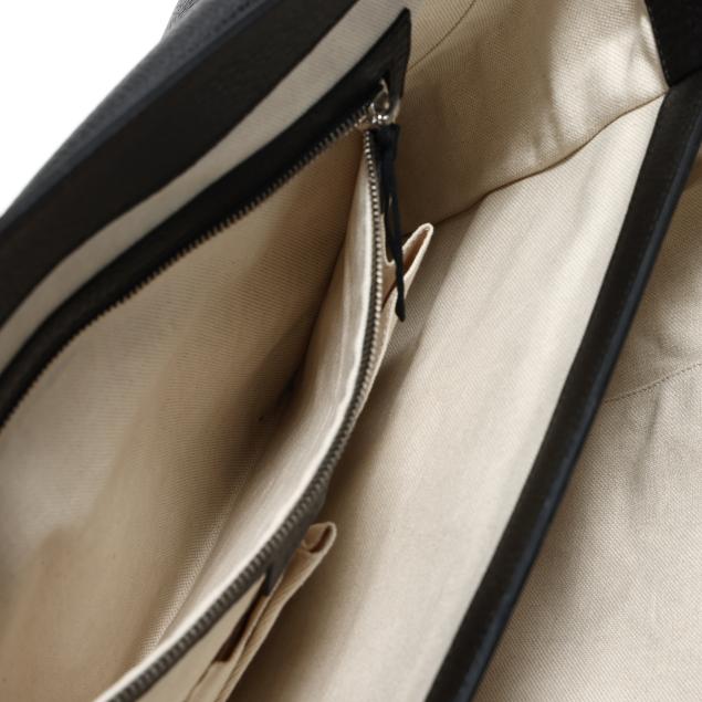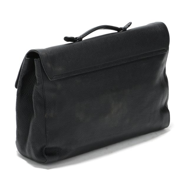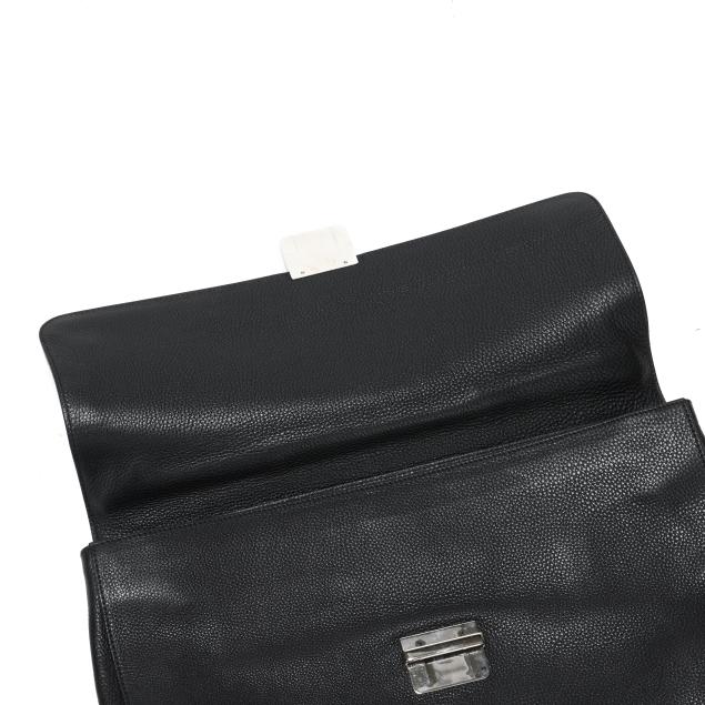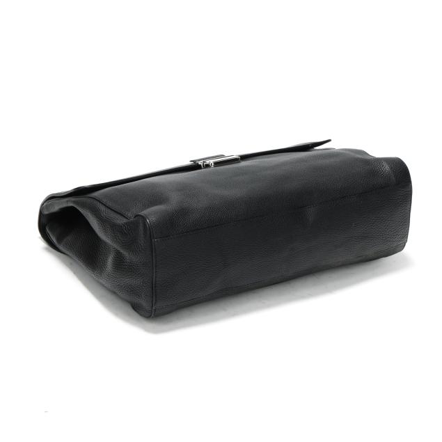 The exterior in black pebbled leather with flat handle and flap over main compartment with signed silver-tone buckle, the interior in cream textile with two main sections, one side zipper pocket, three open pockets, a business card pocket, two pen holders, and leather brand stating made in Italy and numbered 296135 / 001998.