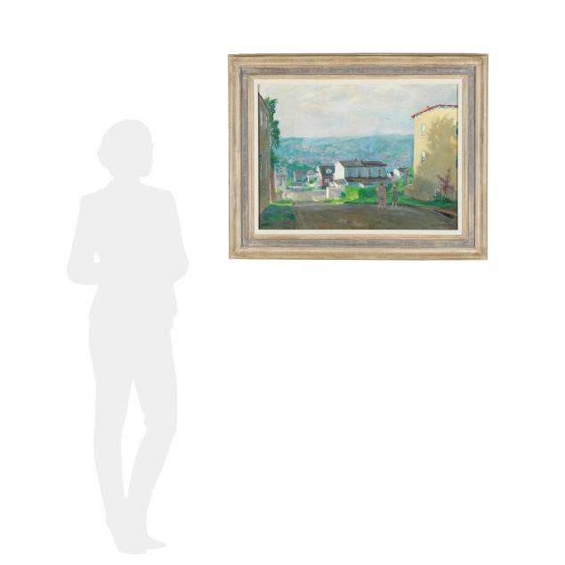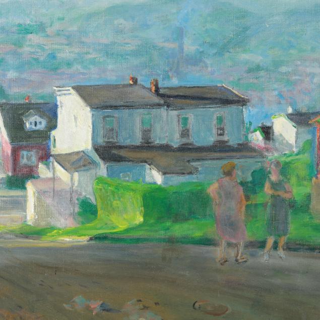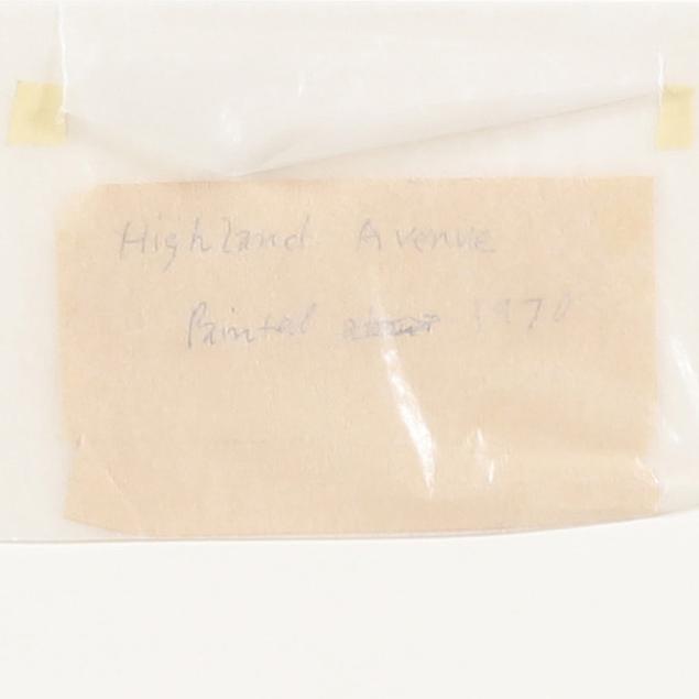 Oil on canvas, 1970, signed and dated at lower right, inscribed on the verso "Are you copying off the houses", retaining handwritten paper label inscribed "Highland Avenue / Painted 1970", framed.