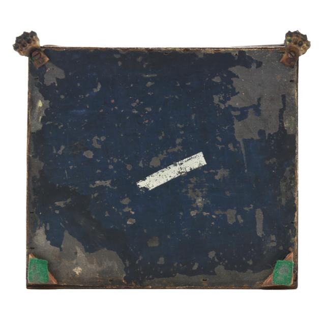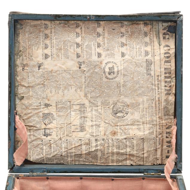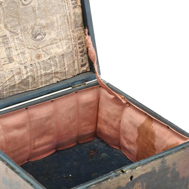 Some scattered molding loss to upper panel; areas of chipping to edges; some paint losses and age toning, some area with old but later paint; staining and tears to upholstered surfaces, top upholstery 19th century, unknown if original to the box.