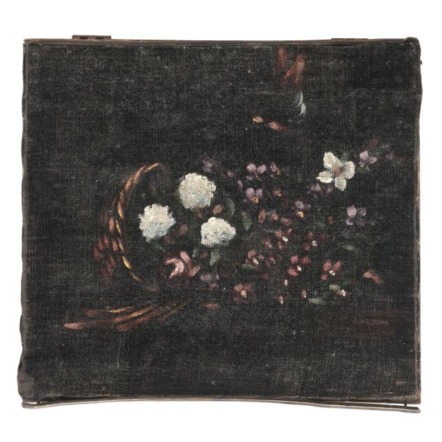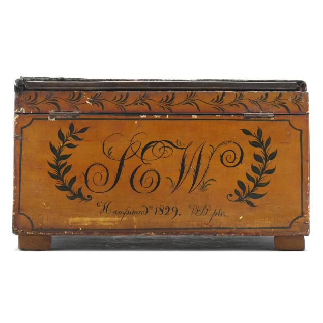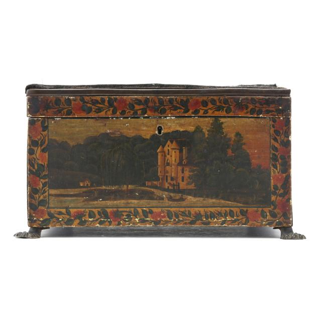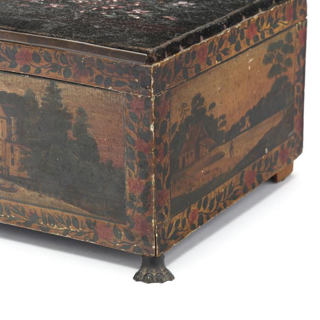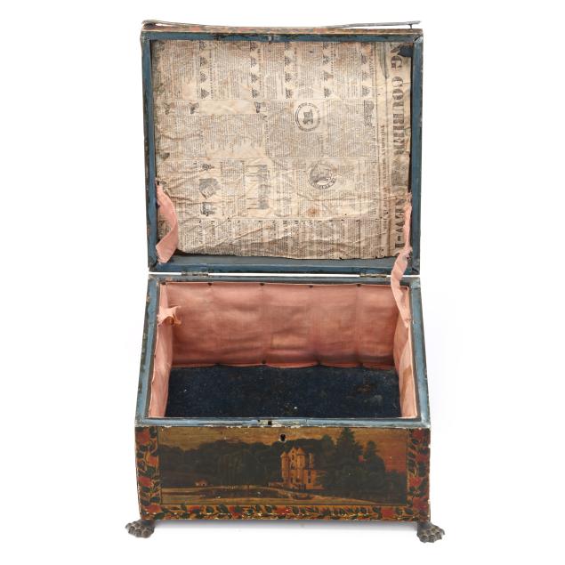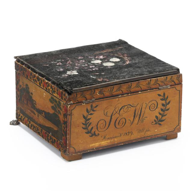 Of rectangular form, featuring hand-painted riverscapes with castle and fishing scenes framed within meandering floral borders, the posterior monogrammed and signed "SEW / Hampstead Octr. 1829. WSP ptr." within a foliate plumes, the upper panel mounted in velvet with hand-painted floral basket decoration, upholstered interior retaining a New York newspaper dated August 1829, raised on paw and block feet.