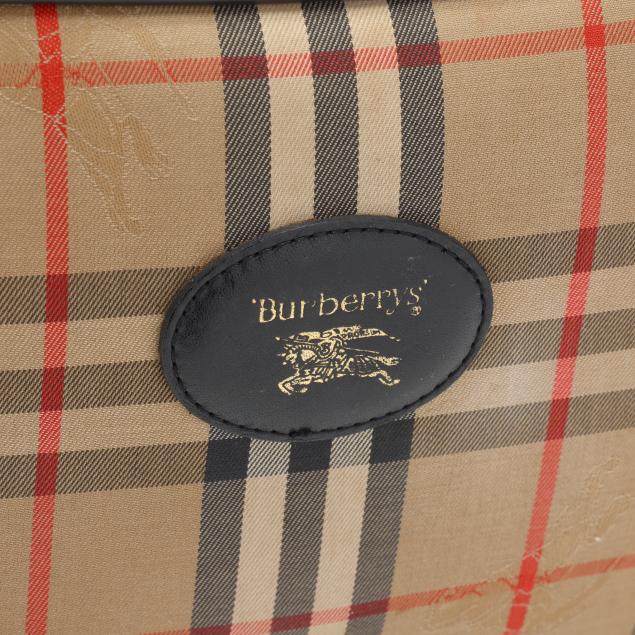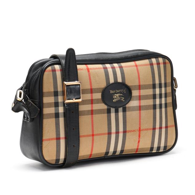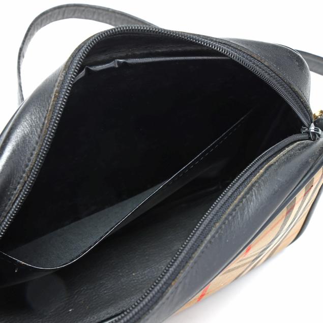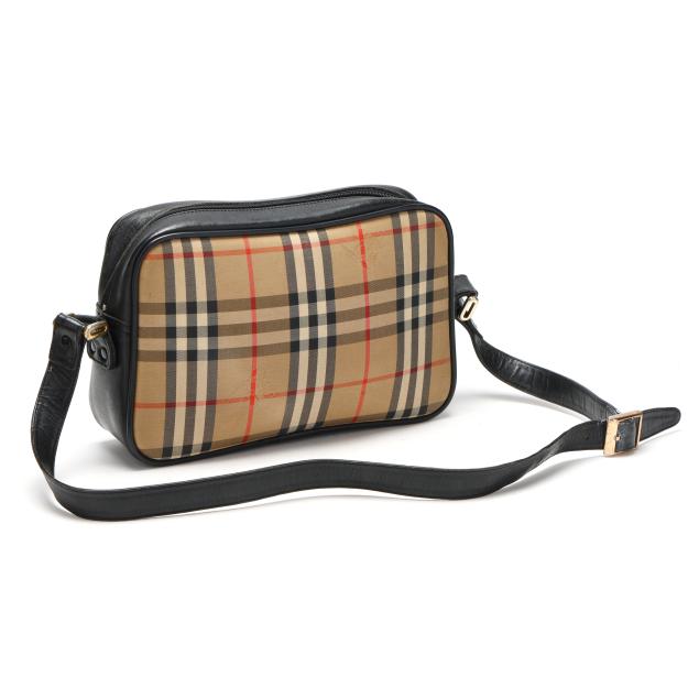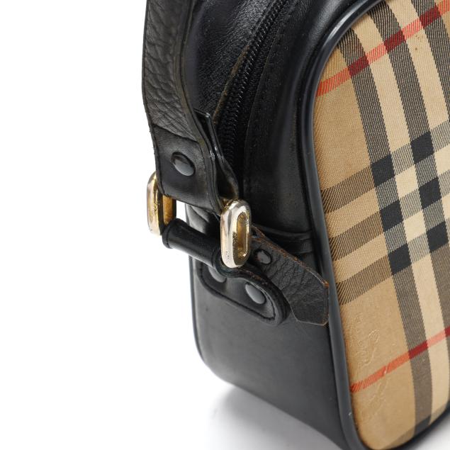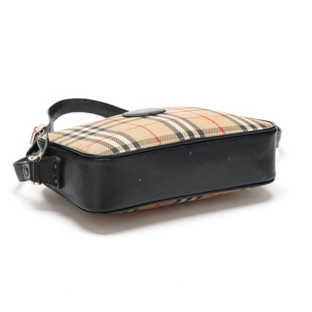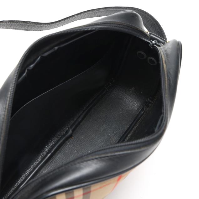 Nova check jacquard fabric with gold-tone hardware, flat leather shoulder strap, leather brand plate, and zippered main pocket, the interior in black leather with single open side pocket.