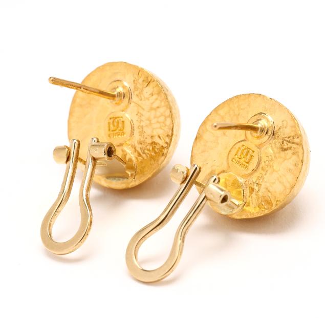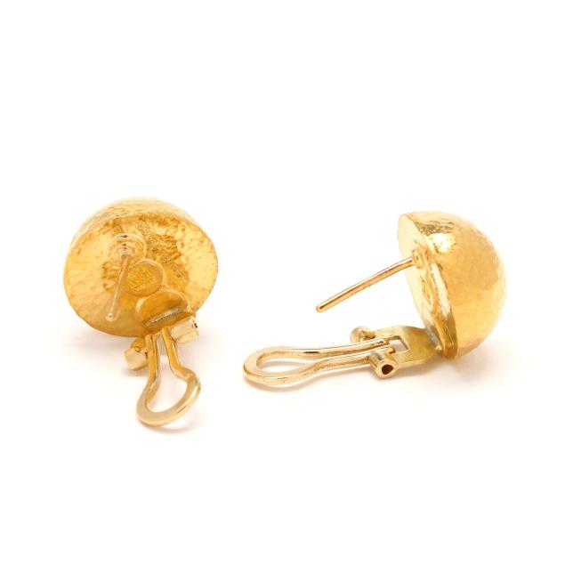Hand-hammered convex button earrings, completed with posts and omega clip backs, stamped with maker's mark, numbered EY244, and inscribed .990, XRF testing 23KT.