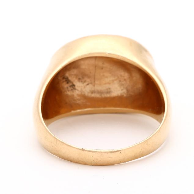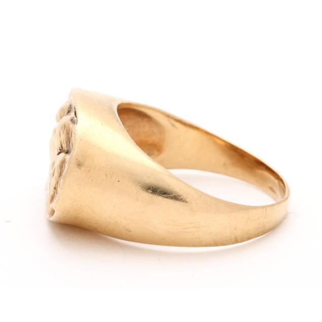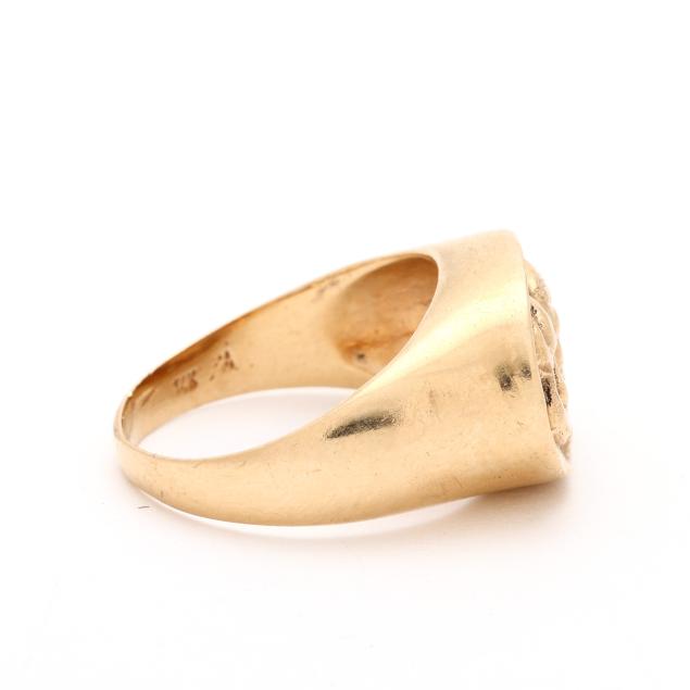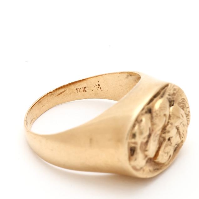 The signet ring with the image of three coursing hounds in high relief, stamped 14K.