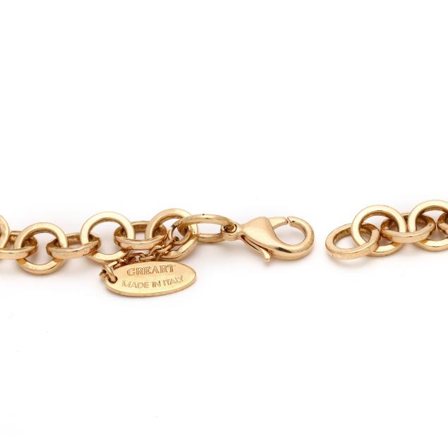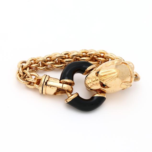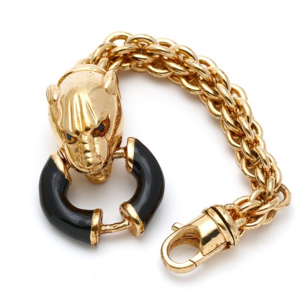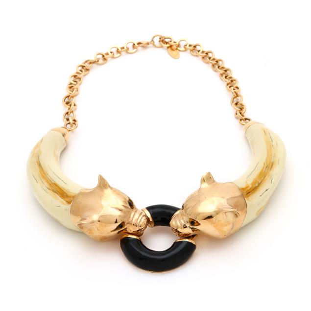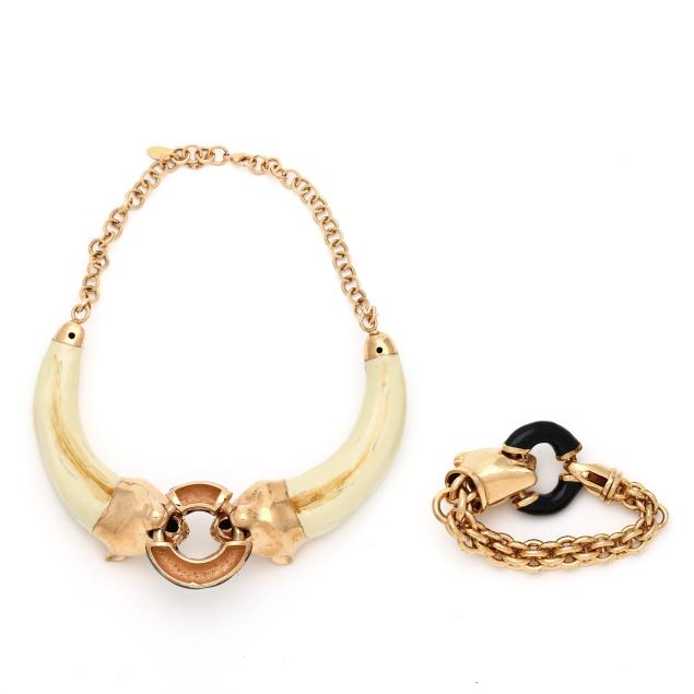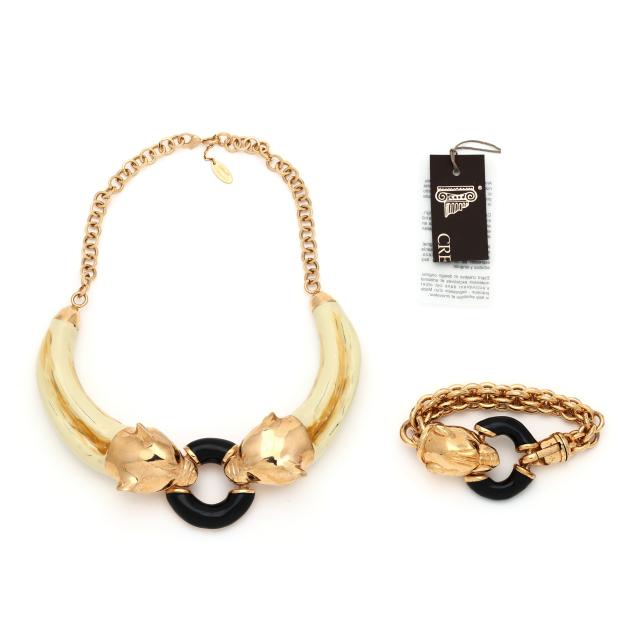 To include: a necklace in gold-tone metal with enamel decorated faux bone elements each terminating in a panther head holding a black enamel decorated ring, completed with a lobster clasp, with tab stamped CREART / Made in Italy (19.5 in.); the bracelet en suite with a single panther head holding a black enamel decorated ring, completed with a lobster clasp (8 in.).