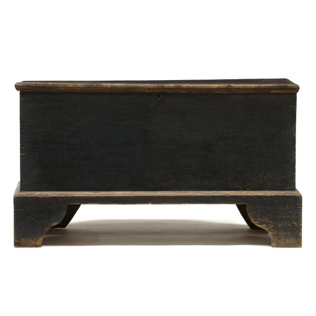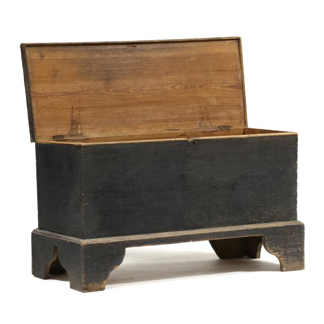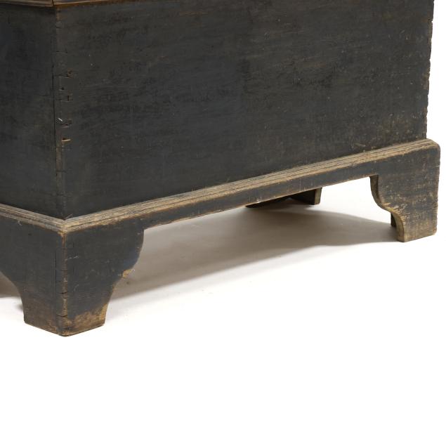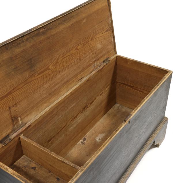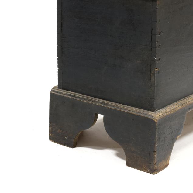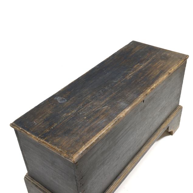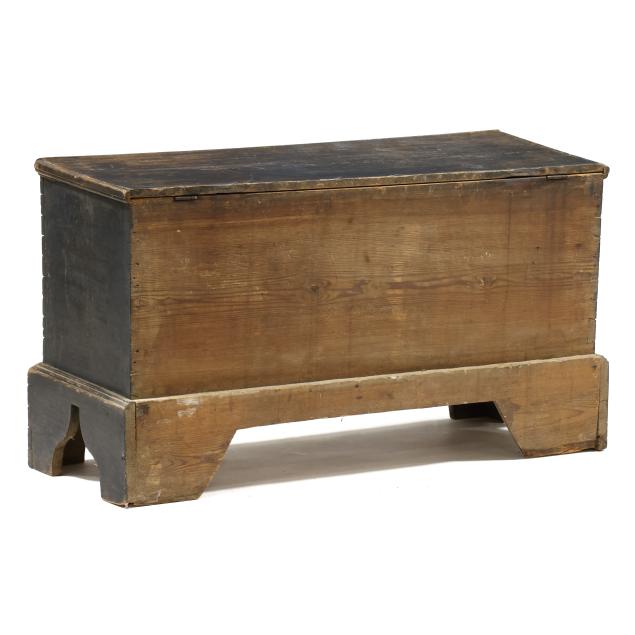 Attributed to Montgomery County, circa 1820, six board yellow pine dovetailed case with all over dark blue original painted surface, hinged lid with later butt hinges and applied molded trim, open till to the left side, distinctive applied bold high dovetailed bracket feet create a strong stance.
