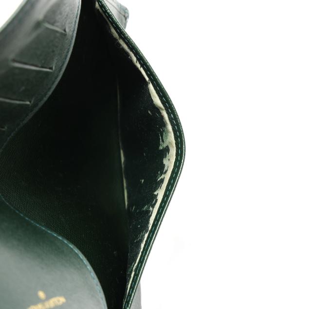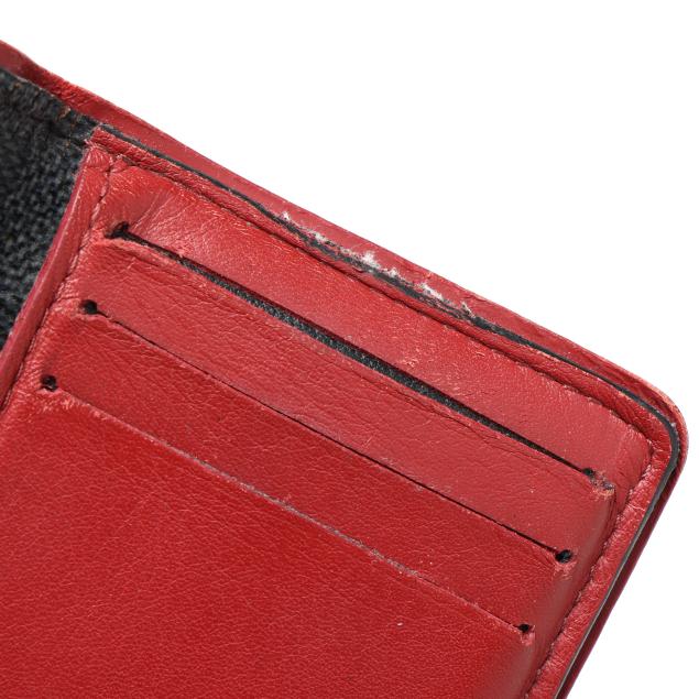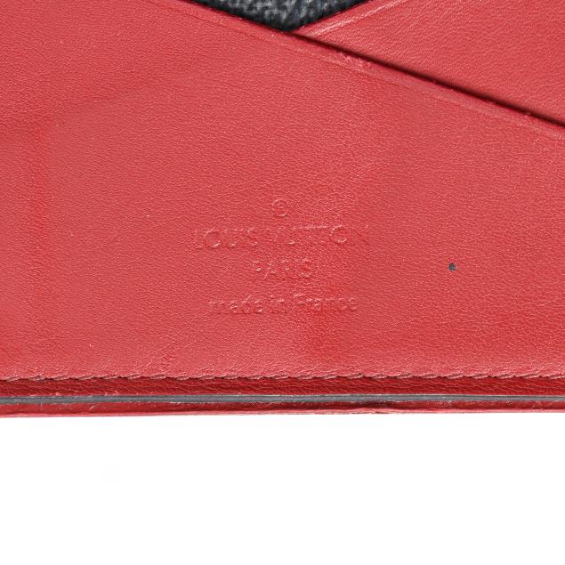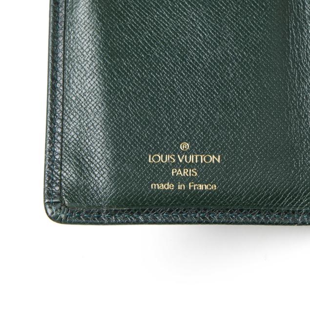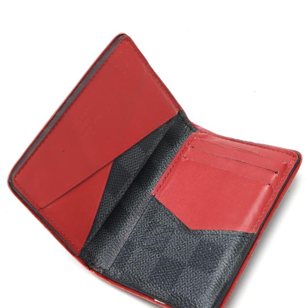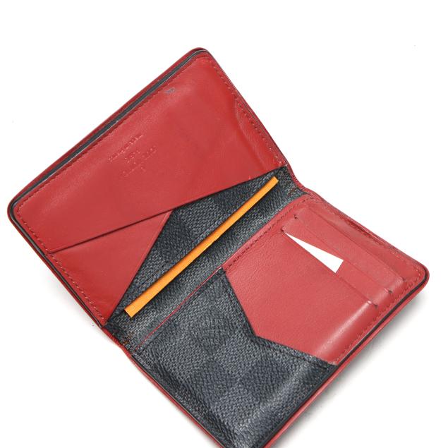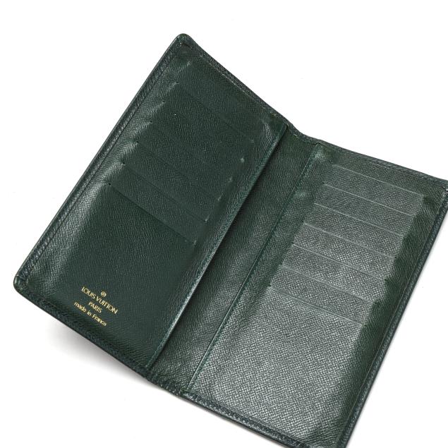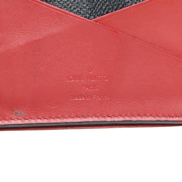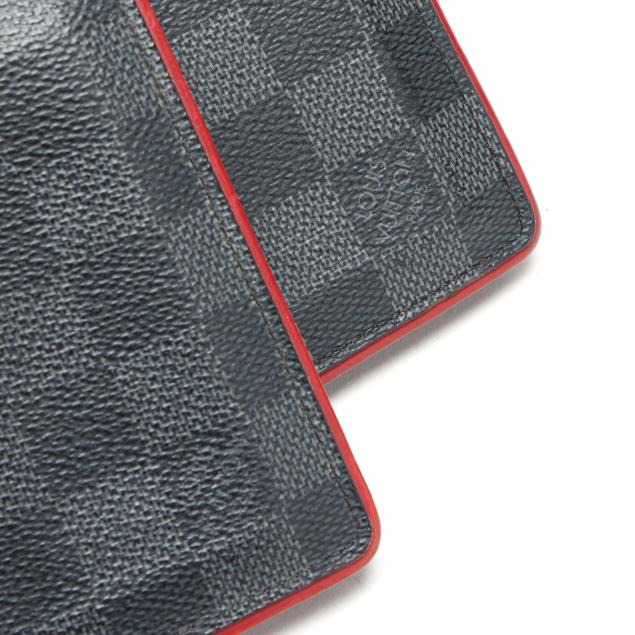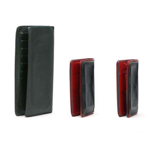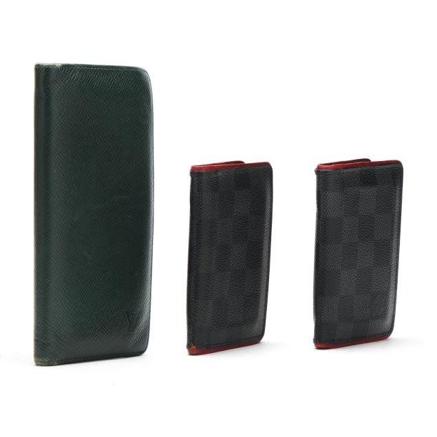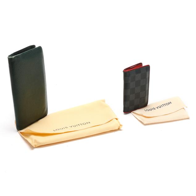 To include: one in green leather with LV monogram to front, with (14) card slots and two pockets (7 x 4 in.) (scuffing to leather around edges; curling to corners; loss to pocket liner); and two in Damier Graphite canvas with red leather accents, exterior smile pocket, (3) card slots, and (4) pockets (4.5 x 3 in.) (scuffing to leather; outline of cards visible to canvas; cracking of materials at fold corners).
