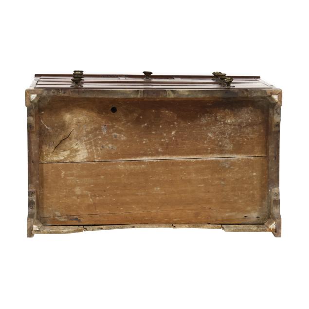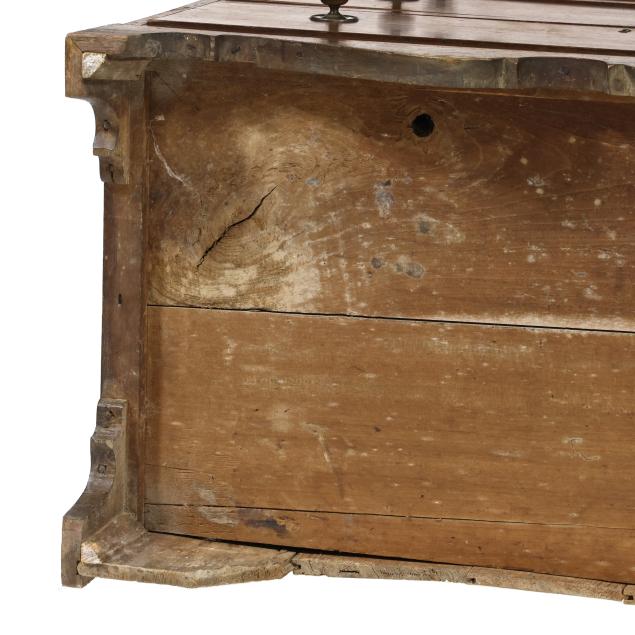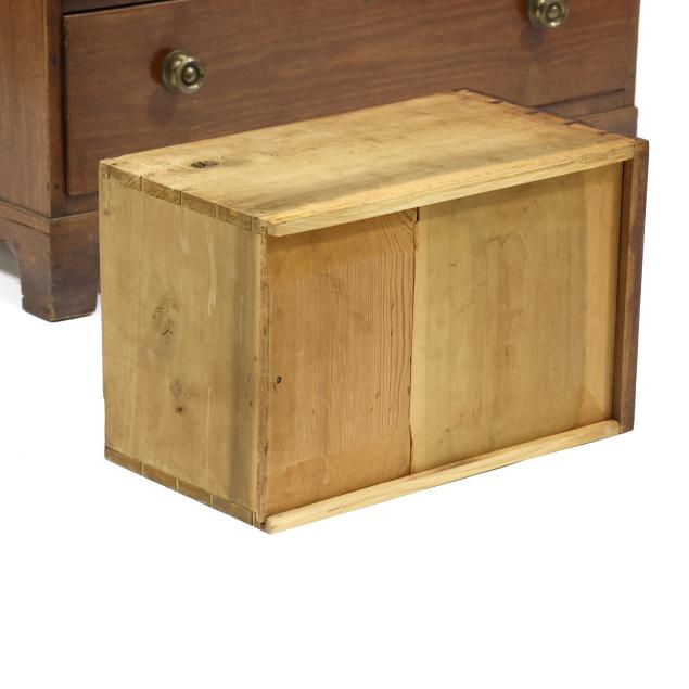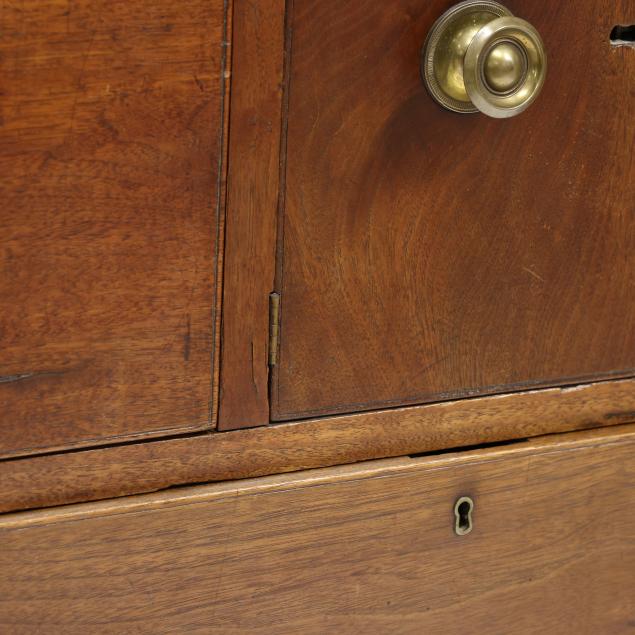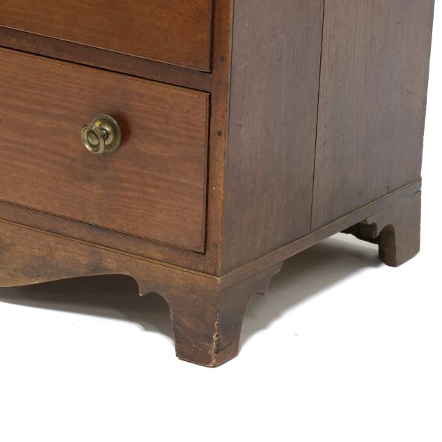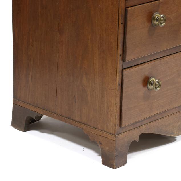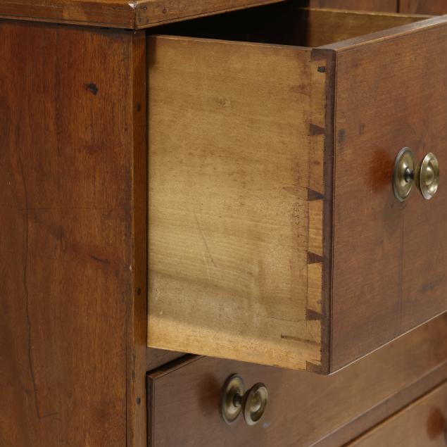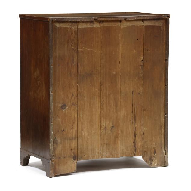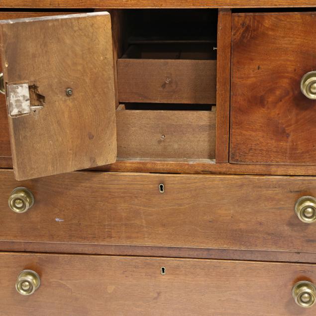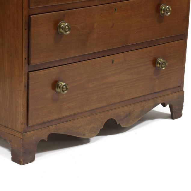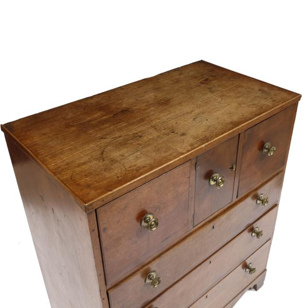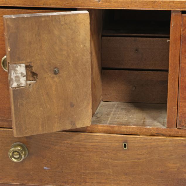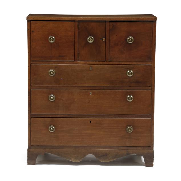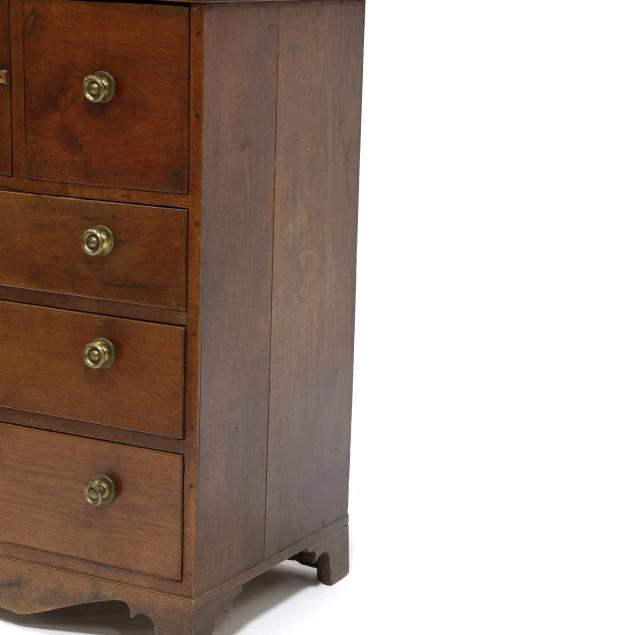 Mecklenburg County, early 19th century, poplar and yellow pine secondary, rectangular dovetailed case with an applied gallery trim at top, the distinctive central prospect door with figured walnut with beveled edge opens to reveal an open compartment above two graduated drawers, flanked by two deep drawers above three graduated long drawers, the door and all drawers with scratch bead, the base with upper scratch bead and featuring a stepped shaped skirt with interior beveled edge, bracket feet with spur.