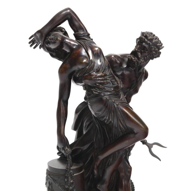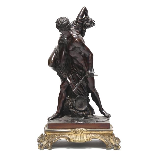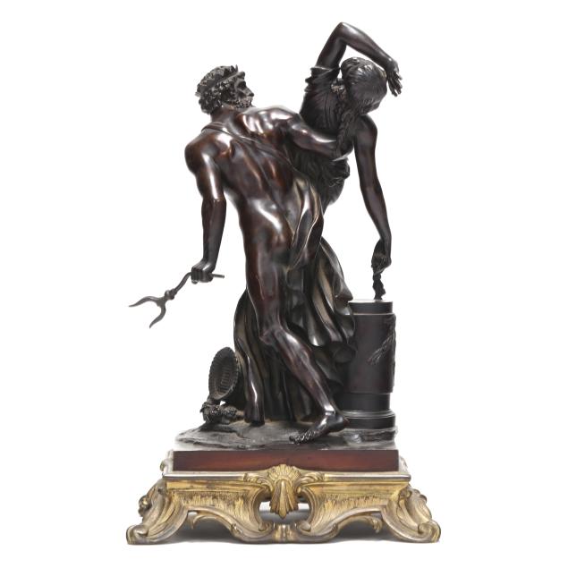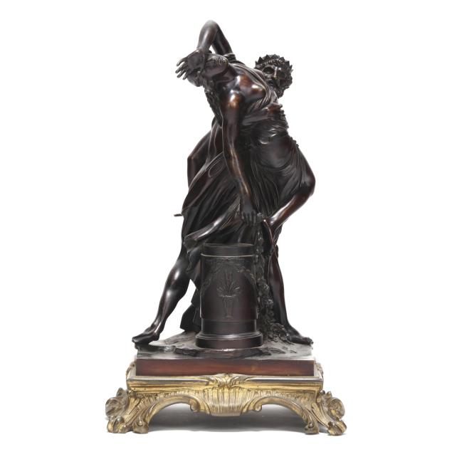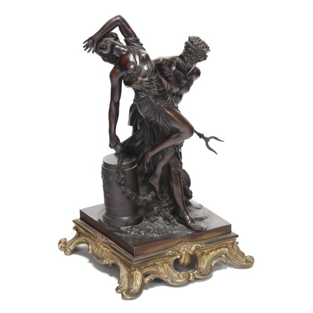 19th century, patinated bronze mythological group depicting Pluto, god of the underworld, abducting Proserpine, the daughter of Ceres, goddess of spring, mounted atop a gilt bronze rocaille base, unsigned.