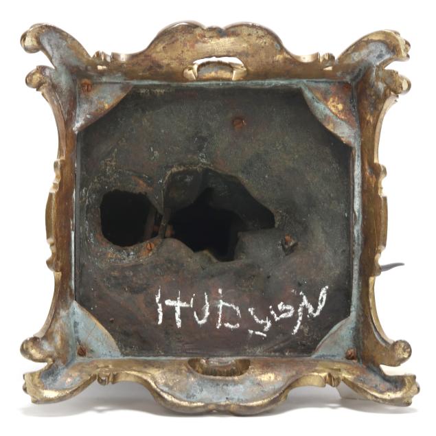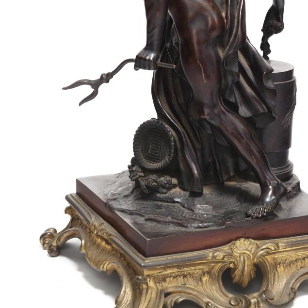 Some areas of rubbing tot he patina and gilt; Pluto's bident with bent shaft.